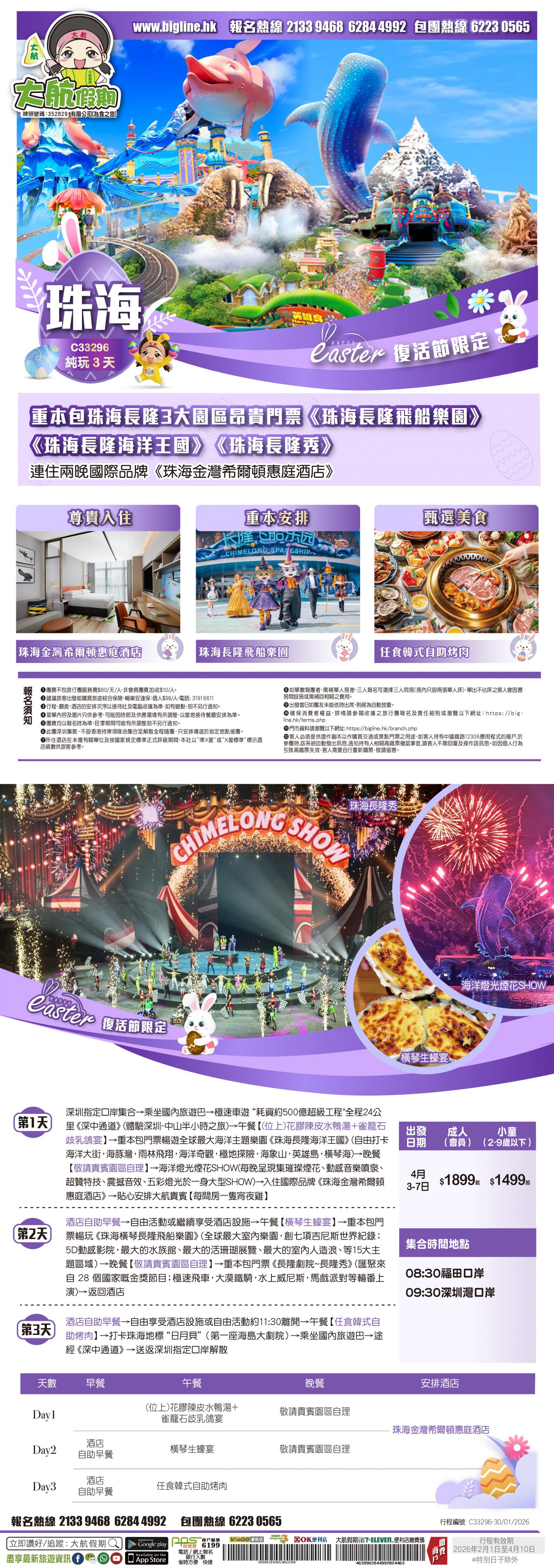 【復活節限定】重本包珠海長隆3大園區昂貴門票《珠海長隆飛船樂園》《珠海長隆海洋王國》《珠海長隆秀》 連住兩晚國際品牌《珠海金灣希爾頓惠庭酒店》純玩3天