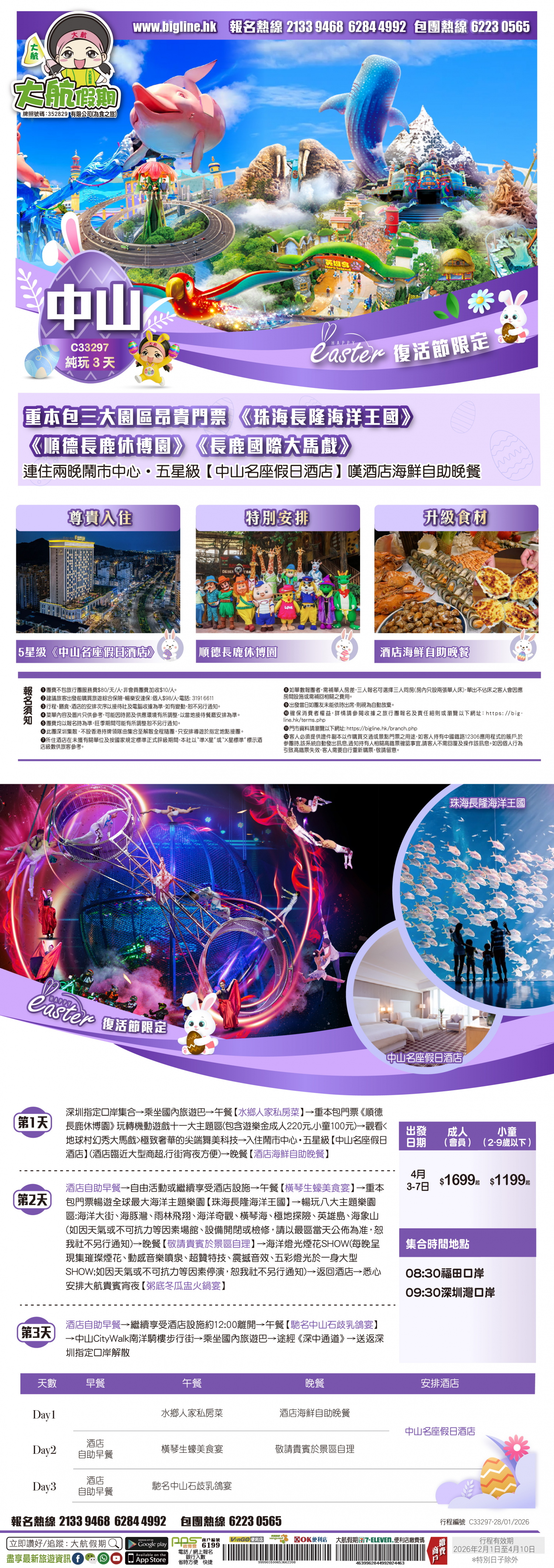 【復活節限定】重本包三大園區昂貴門票《珠海長隆海洋王國》《順德長鹿休博園》《長鹿國際大馬戲》連住兩晚鬧市中心•五星級【中山名座假日酒店】嘆酒店海鮮自助晚餐 純玩3天