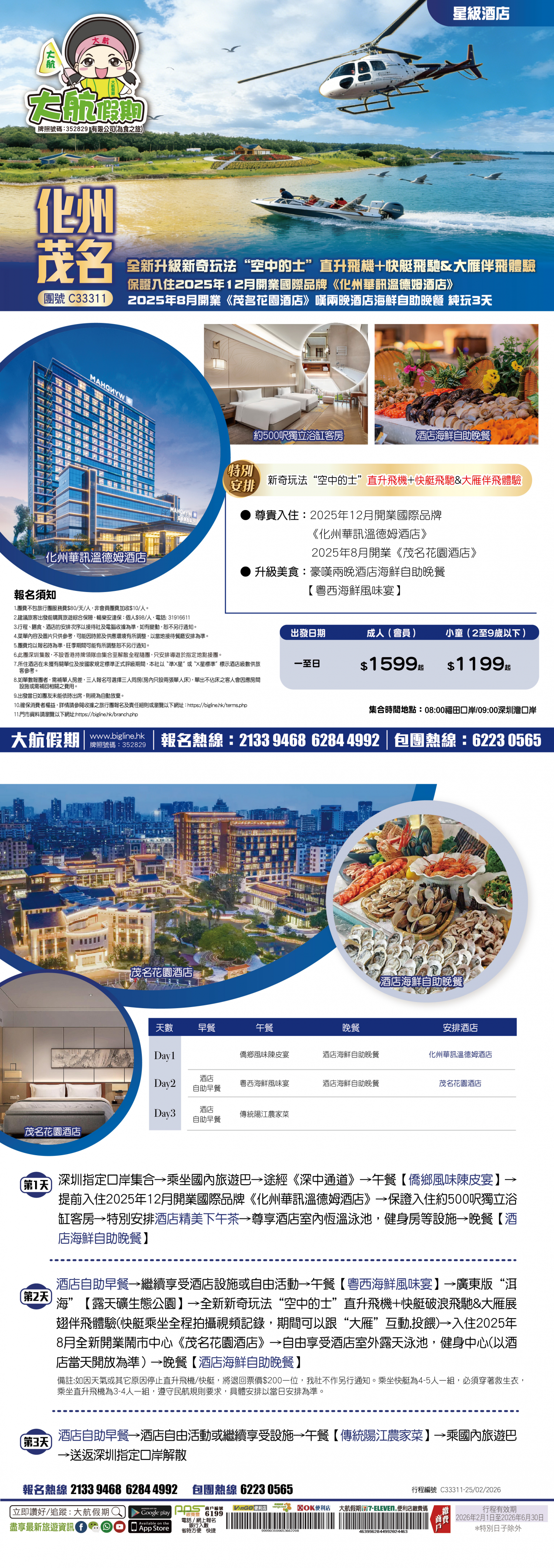 【星級酒店】全新升級新奇玩法“空中的士”直升飛機+快艇飛馳&大雁伴飛體驗 保證入住2025年12月開業國際品牌《化州華訊溫德姆酒店》+2025年8月開業《茂名花園酒店》嘆兩晚酒店海鮮自助晚餐 純玩3天