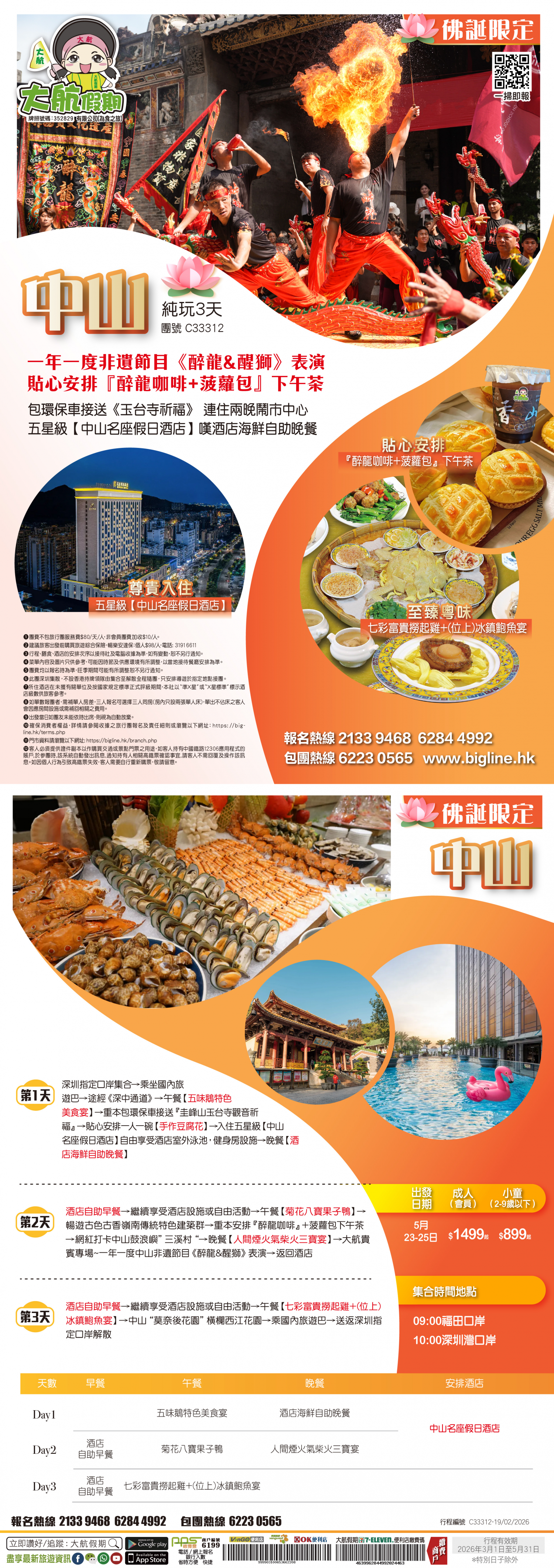 【佛誕限定】一年一度非遺節目《醉龍&醒獅》表演 貼心安排『醉龍咖啡+菠蘿包』下午茶 包環保車接送《玉台寺祈福》 連住兩晚鬧市中心~五星級【中山名座假日酒店】嘆酒店海鮮自助晚餐 純玩3天