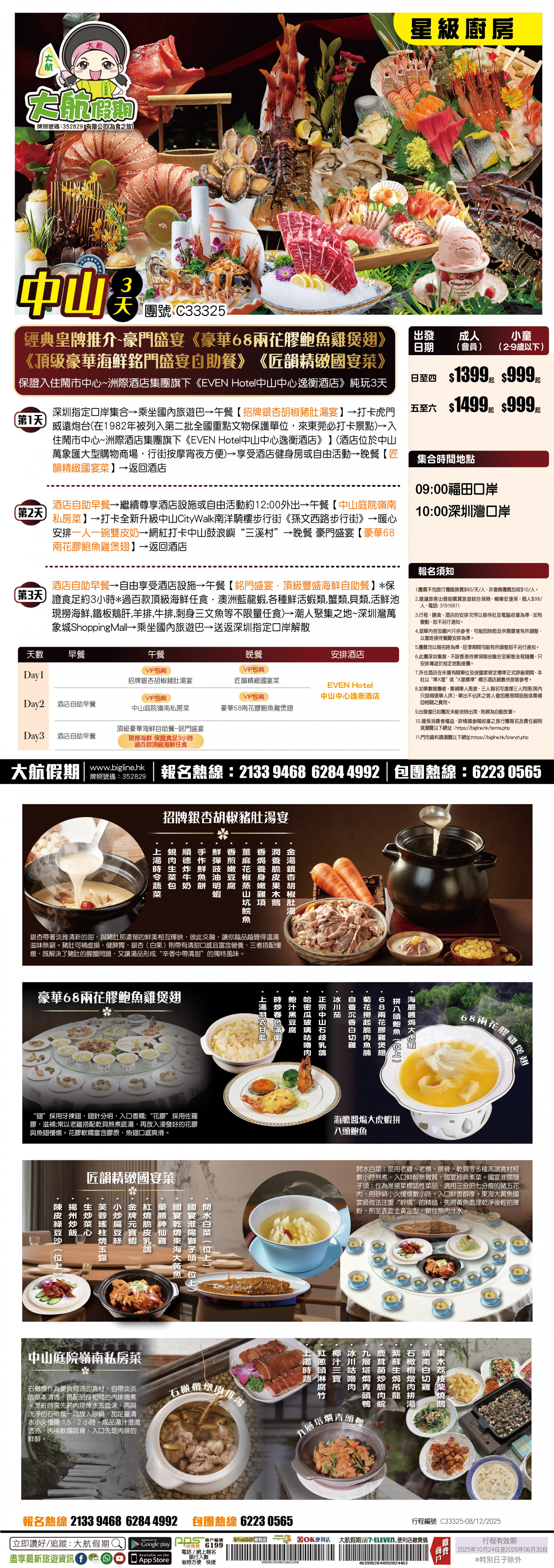 | 第2天 | 酒店自助早餐 | 匠韻精緻國宴菜 | 豪華68兩花膠鮑魚雞煲翅 | 中山中心逸衡酒店 |