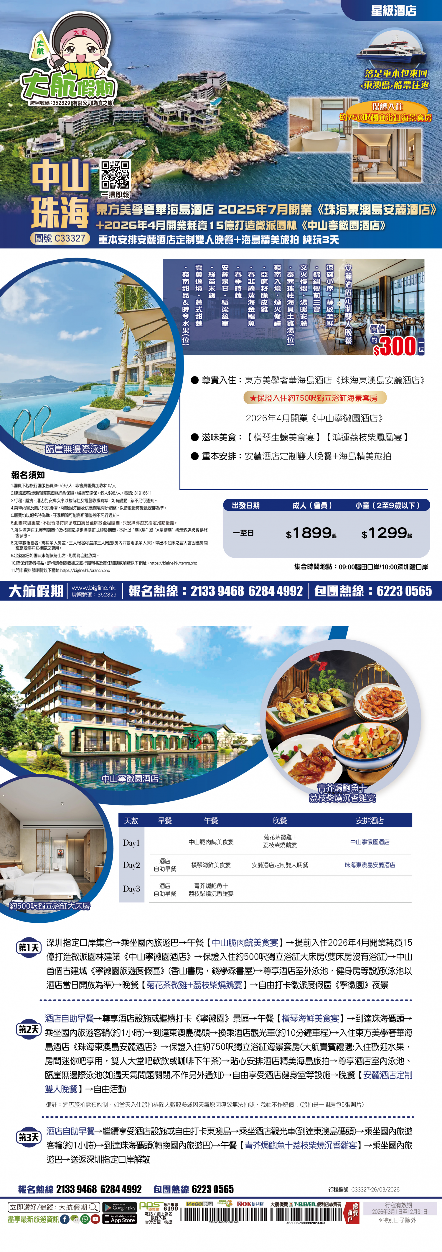 | 第2天 | 酒店自助早餐 | 橫琴海鮮美食宴 | 雙人套餐 | 珠海東澳島安麓酒店 |