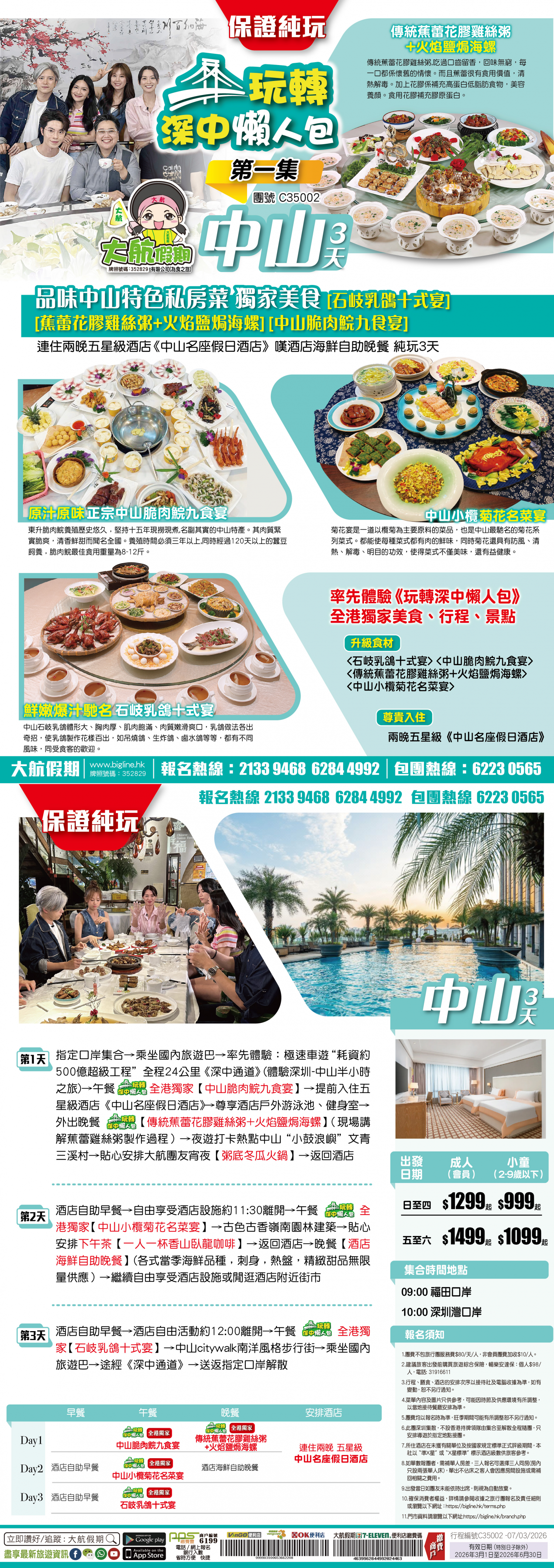 | 第1天 | 中山脆肉鯇九食宴 | 傳統蕉蕾花膠雞絲粥+火焰鹽焗海螺 | 中山名座假日酒店 | |