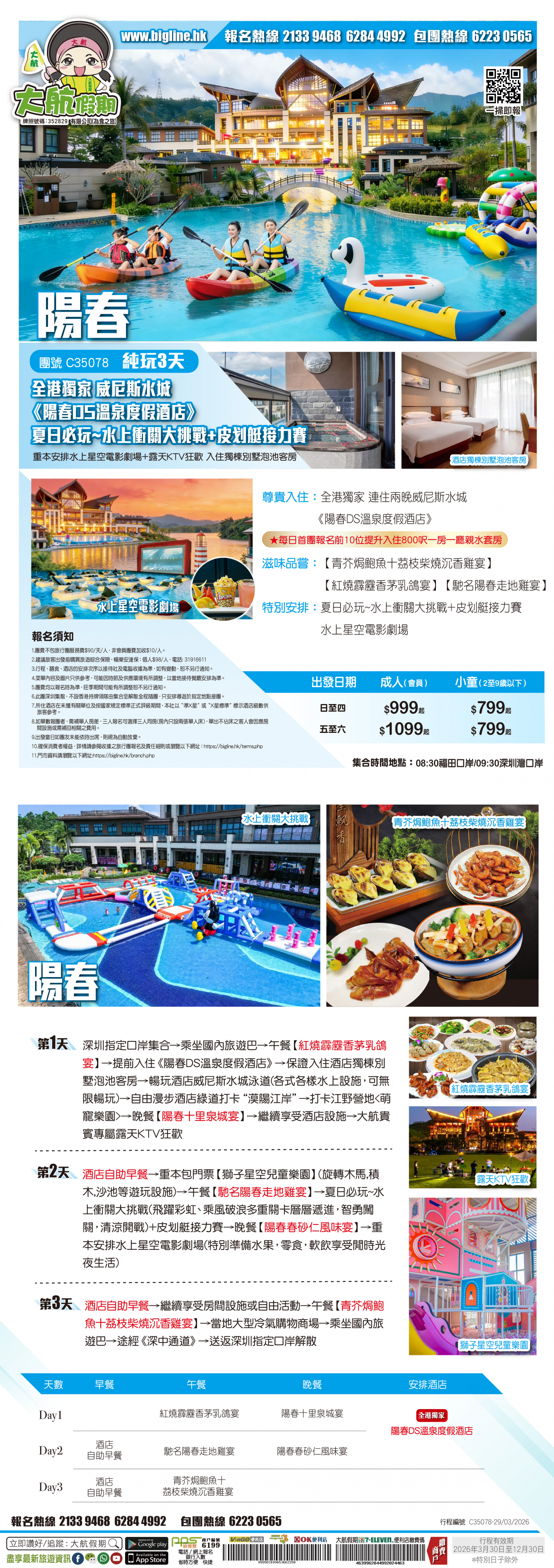 | 第2天 | 酒店自助早餐 | 馳名陽春走地雞宴 | 陽春春砂仁風味宴 | 陽春DS溫泉度假酒店 |