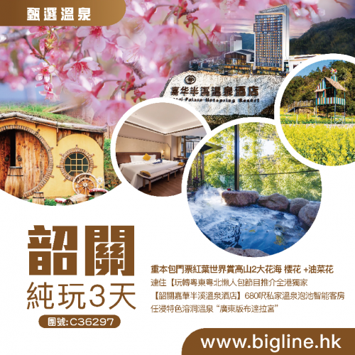 【甄選溫泉】重本包門票紅葉世界賞高山2大花海 櫻花 +油菜花 連住玩轉粵東粵北懶人包節目推介全港獨家【韶關嘉華半溪溫泉酒店】680呎私家溫泉泡池智能客房任浸特色溶洞溫泉 “廣東版布達拉宮”純玩3天