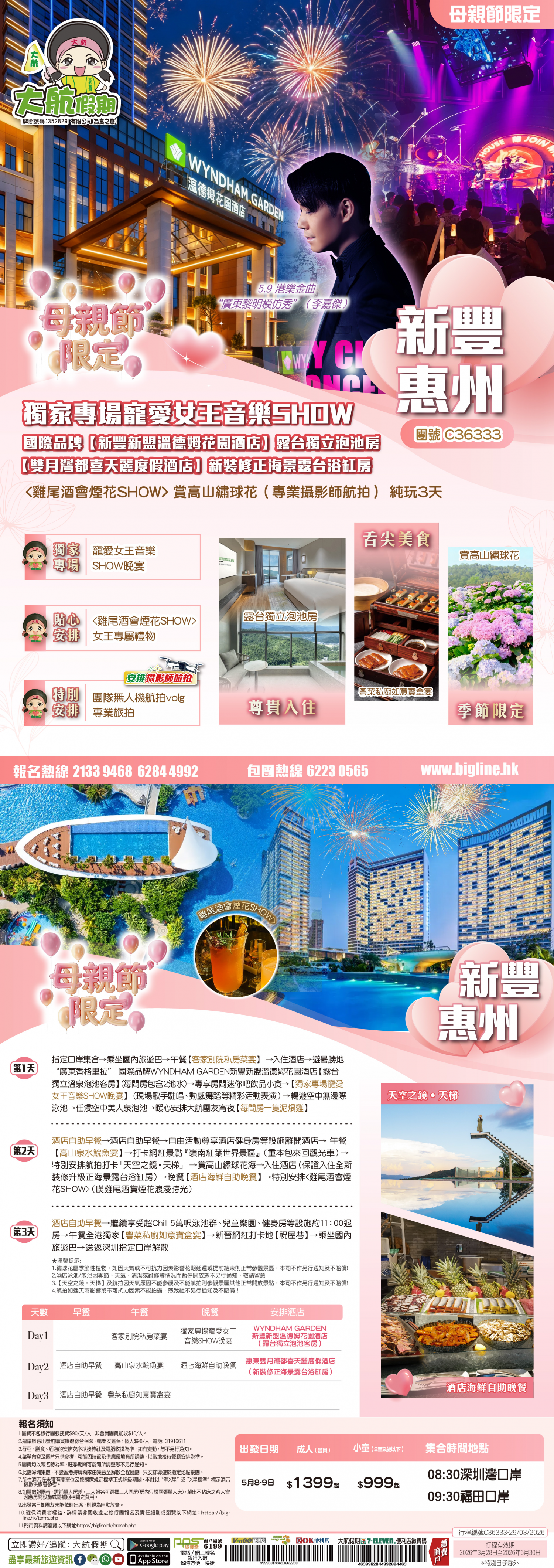 | 第1天 | 客家别院私房菜宴 | 【獨家專場寵愛女王音樂SHOW晚宴】 (現場歌手駐唱、動感舞蹈等精彩活動表演) | 韶關新盟溫德姆花園酒店 | |
