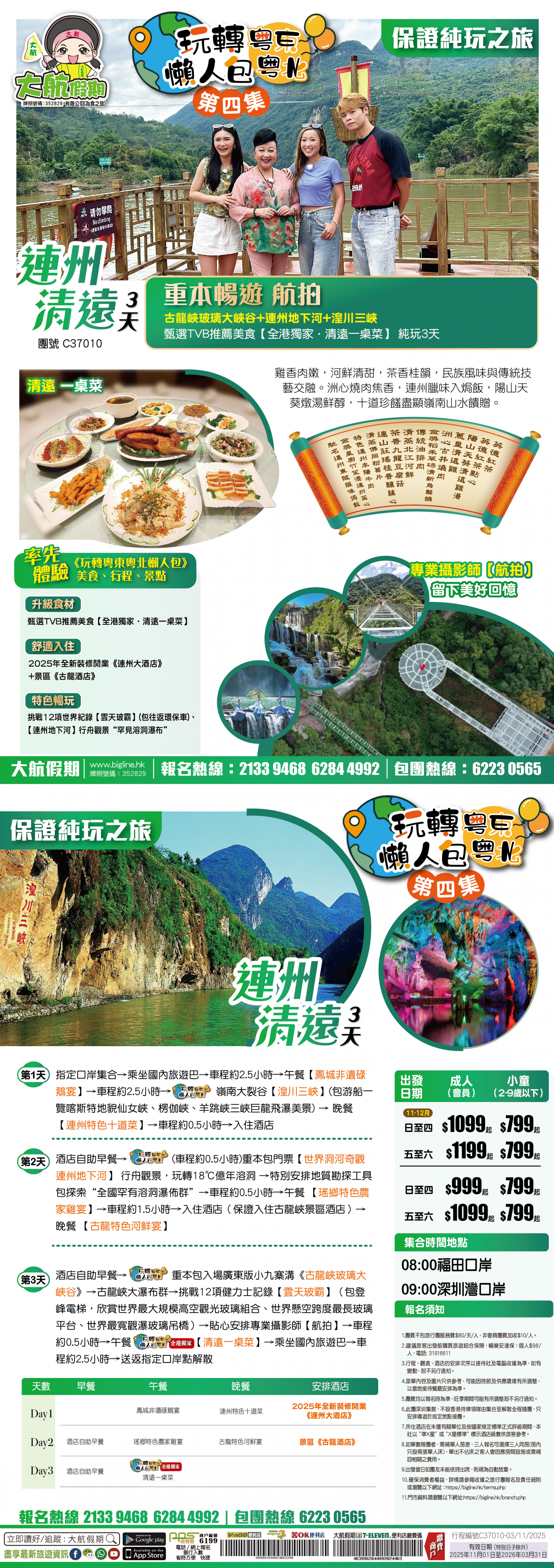 《玩轉粵東粵北懶人包 第四集》重本暢遊 航拍《古龍峽玻璃大峽谷+連州地下河+湟川三峽》甄選TVB推薦美食【全港獨家·清遠一桌菜】 純玩3天