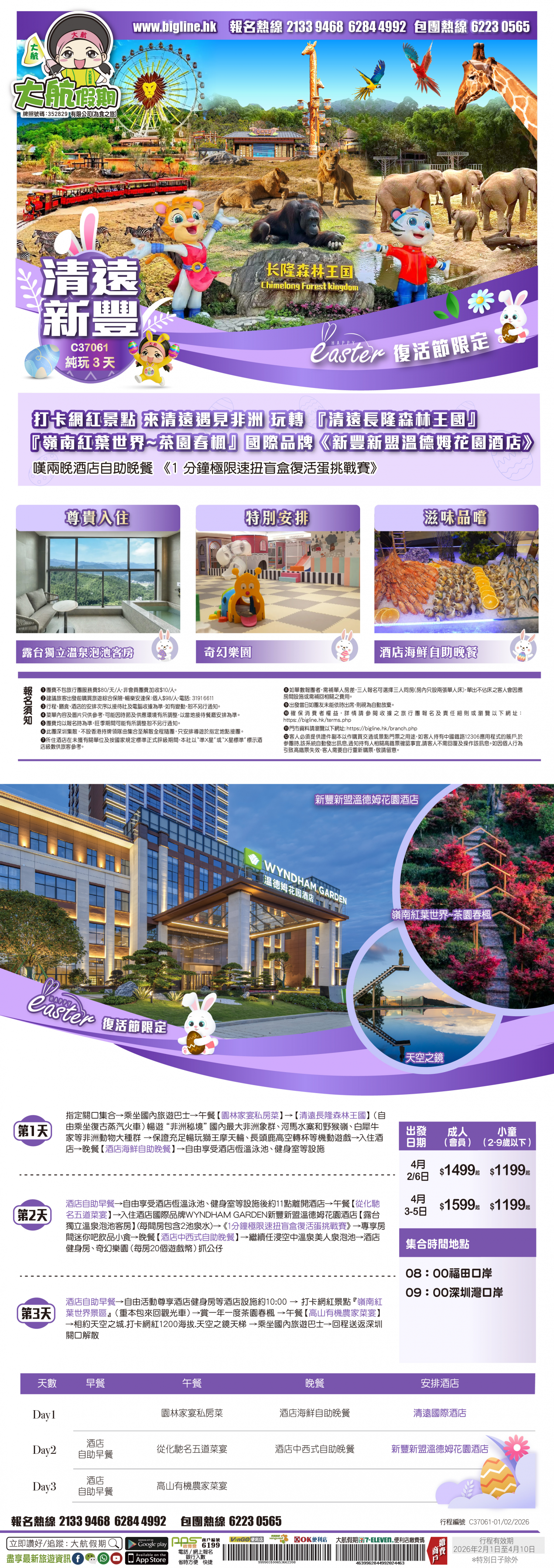 *團員繳付退票費後 (如適用): 1) 已繳款項可保留半年; 或 2) 選擇轉團後, 餘款則保留半年; 或 3) 可繳付『迫不得已理由』之手續費後, 取回已付餘款。 *個別機票+酒店套票產品如因『迫不得已理由』取消外遊行程, 處理旅客退款時亦按以上訂列收取每位退票費及手續費, 並以行程表 (套票單張) 所列為準。 責任細則: 1. 本公司保留合併團隊出發的權利。 2. 行程書或單張內所列費用根據當時機票價格及國際貨幣兌換率而訂立。外幣浮動等情況之下, 本公司保留在出發前調整各項費用的權利及徵收額外費用。 3. 所有列出的交通服務資料只供參考, 如有更改概不負責, 一切須以出票時為準。 4. 除本公司直接提供之服務外, 本公司及其職員或附屬公司或與本公司有經營關係之公司代理人身份在香港或外地安排其他獨立機構所提供之交通工具 (如飛機、輪船、火車、或遊覽巴士等) 、住宿、膳食或娛樂觀光項目等 (“委託機構”), 團員如遇交通延誤、行李遺失、意外傷亡或財物損失等, 該依照當地法律向擁有、管理或操作之委託機構直接交涉或追討賠償, 通常該等機構均各訂位不同條例, 以對客人負責。在此情況下, 本公司概不對該等損失或傷亡負責。 5. 除因由本公司之員工或其他直接管理或操作之機構之疏忽而引致團員之個人傷亡外, 本公司對團員在任何意外中之個人傷亡、經濟、娛樂或精神損失概不負責。 6. 除經本公司同意及安排, 如團員自行更改由其他人士代為參團, 本公司或其委託機構之職員有權取消其隨團之資格, 而無須發還任何團費, 而該人士在隨團期間之保險、責任賠償、行為後果等均由該人仕自行承擔。 7. 如因天氣、罷工、戰爭、怠工或安全情況影響而引致有關交通工具暫停服務, 停航或其他事故, 而必須將行程更改或取消部份行程, 本公司則將團員所繳交之費用扣除因以上事故而引致之損失後, 退回差額給團員。 8. 有關住宿、膳食、遊覽節目等問題, 均依據行程表安排, 行程先後次序有可能需要更改, 一切以當地安排為準。若遇特殊情況, 如簽證受阻, 當地酒店突告客滿或航機改變飛行時間或地點, 以及非本公司或其委託機構所能控制之因素, 令旅行團節目有增減, 或臨時更改交通工具、班機時間、機種及更換酒店等等, 本公司或其委託機構得依當時情況全權盡力處理, 團員不得藉故反對或退出, 因故取消之節目, 將不獲退還款項, 任何因延期而引致之額外支出, 本公司或其委託機構概不負責。 9. 所有酒店及住宿根據行程安排, 本公司視乎當時情形作出更改, 但不限於遇展覽會或特殊情況下, 將住宿鄰近城市之同等級酒店及住宿代替。本公司如因『迫不得已理由(外遊)』(即指戰爭、政治動盪、恐怖襲擊、天災、疫症、惡劣天氣、交通工具發生技術問題、載運機構臨時更改班次或取消服務、罷工、工業行動、旅遊目的地政府或世界衛生組織發出旅遊警示(警告)、香港特別行政區政府發出紅色或黑色外遊警示、不可抗力事件,以及業界不能控制的其他不利離開香港或在香港境外旅遊的情況)於外遊旅行團出發後更改任何項目而引致成本增加,可向顧客徵收額外費用。 10. 【已成團】代表該團號之指定出發日期預訂機位或已有足夠人數報名參加。但出發與否還受其他因素影響, 本公司保留最終決定權。 11. 任何團員在參與各項活動時, 如經常不遵守服飾人員之指引或安排, 在行動或言語上侮辱或滋擾其他團員或工作人員, 本公司或其委託機構職員有權視具體情況而取消其隨團資格而母須發任何團費, 而受該旅客監護之18歲以下同行團員亦須一併離開, 有關旅客離團後一切活動, 概與本公司或其委託機構無關。 12. 團員如欲於旅程完畢後延期返港, 須於出發前十四天提出, 以便本公司代為預定返港機位, 延期返港之機位, 未能即時作實, 團員不得藉此理由要求退出, 旅程完畢後延期逗留之費用, 概由團員自負。 13. 延期返港之團友, 必須在離境前七十二小時向航空公司確實回程機位, 任何機位如有變更, 概與本公司無關。 14. 團員如在旅途中自行離團或放棄行程, 離團後之責任自負, 一切後果與本公司或其委託機構無關。 15. 參團者須切實遵守各國及各地法例, 包括但不限於防疫防控條例, 並嚴禁攜帶違例物品出入境, 並照實申報攜帶之物品及現金。 16. 任何種類的簽證審批權及出入境批准權一律由該國或地區之領事館及/或出入境部門全權決定, 出入境如有問題, 責任旅客自負, 本公司或其委託機構母須負任何責任。如簽證已代辦, 簽證費恕不退還。 17. 即使團員持有效之入境簽證及旅遊證件, 而於入境時被當值之移民局海關人員拒絕入境, 本公司或其委託機構亦無須負任何責任。所需額外安排之食宿、交通費用、全部由其本人負責, 其餘下的行程亦將不會獲得任何補償, 亦不得要求退款或改團。 18. 中國內地相關法規規定, 即日起旅客入住中國內地境內酒店時, 公安機關會透過酒店前台向旅客一併採集人像信息資訊。 19. 如出現一些非本公司能力範圍可控制之問題 (如花卉、紅葉提早凋謝或景觀、自然現象、景點活動或戶外項目) 會受天氣等因素影響, 如未能安排則取消不作任何退款安排。 20. 旅客如在旅程中確診 COVID-19或其他傳染病,無論受到當地政府隔離或其他檢疫要求影響與否,為確保其他旅客之安全,確診旅