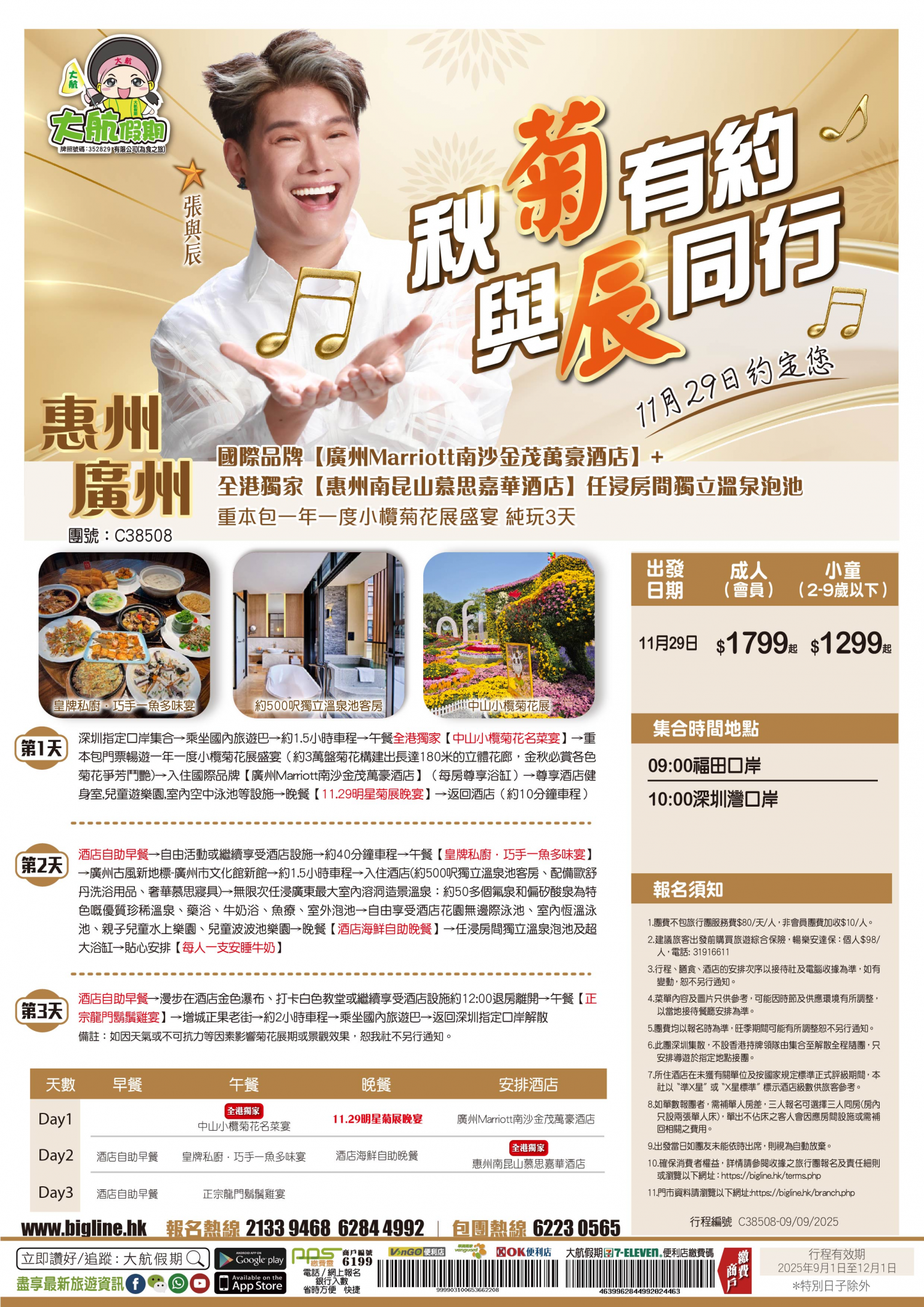 【11.29菊展晚會】秋菊有約 「與辰」同行 國際品牌【廣州Marriott南沙金茂萬豪酒店】+全港獨家【惠州南昆山慕思嘉華酒店】任浸房間獨立溫泉泡池 重本包一年一度小欖菊花展盛宴 純玩3天