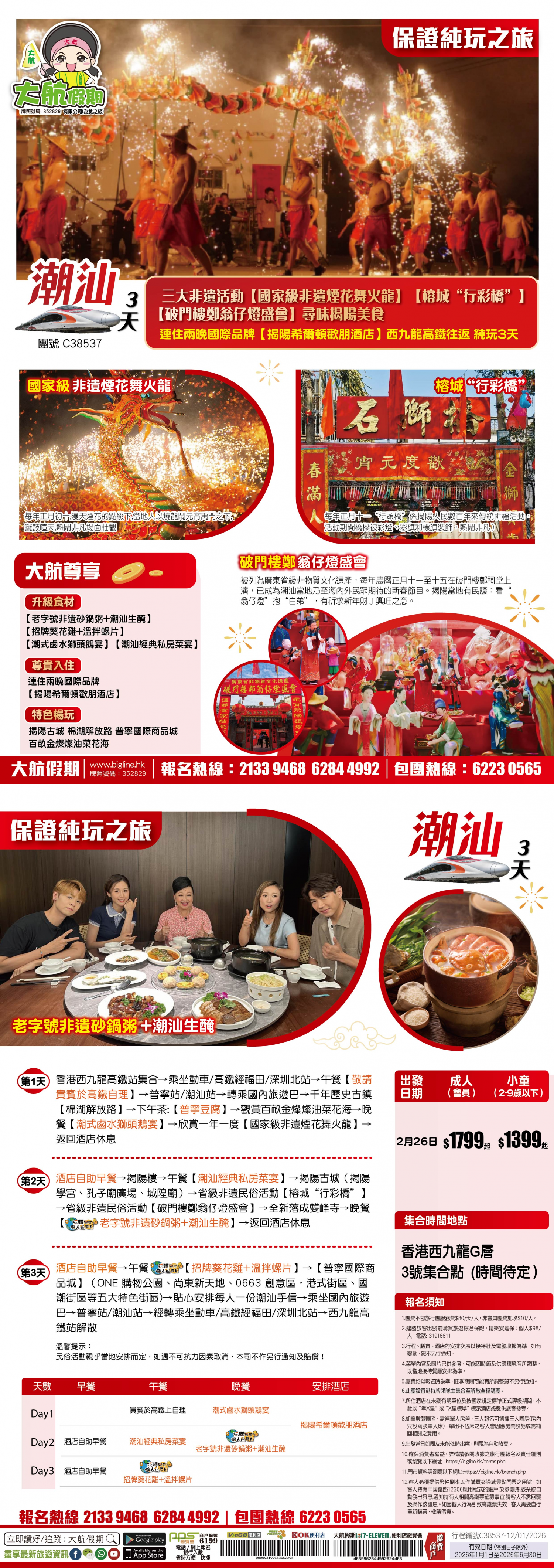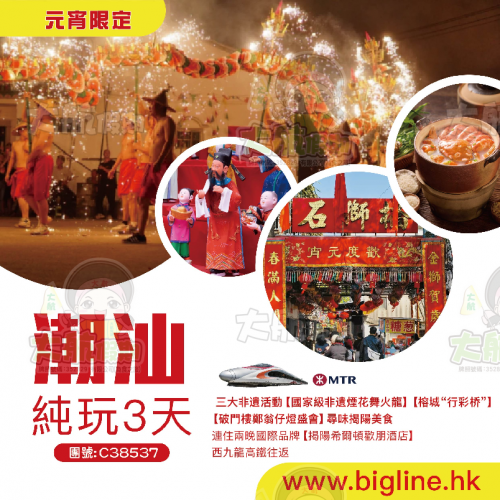【春節限定】西九龍高鐵往返 年味潮汕 非遺新春巡遊 英歌舞 舞火龍 標旗 營老爺 潮遊南澳島 賞一年一度迎春桃花 純玩3天