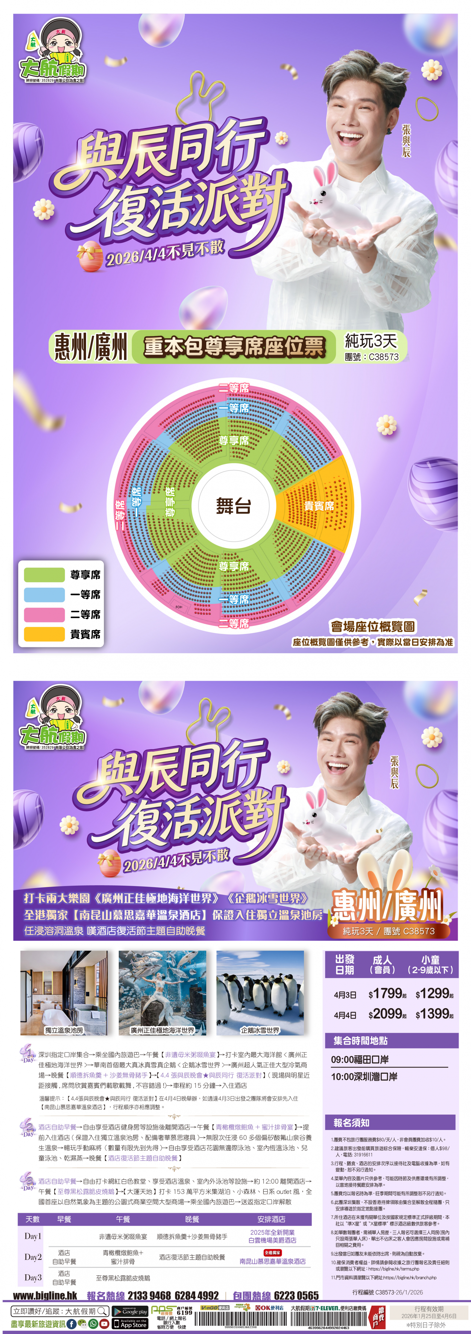 【4.4張與辰晚會★尊享席座位票】《與辰同行 復活派對》全港獨家【南昆山慕思嘉華溫泉酒店】保證入住獨立溫泉池房 任浸溶洞特色溫泉 嘆酒店復活節主題自助晚餐 純玩3天