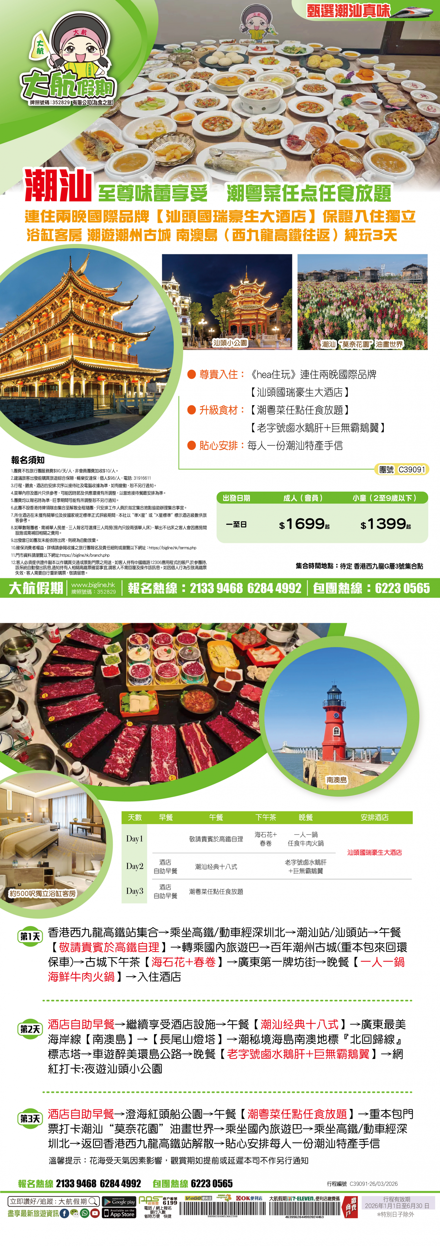 | 第2天 | 自助早餐 | 潮汕經典十八式 | 老字號鹵水獅肝+巨無霸鵝翼 | 汕頭澄海國瑞豪生酒店 |
