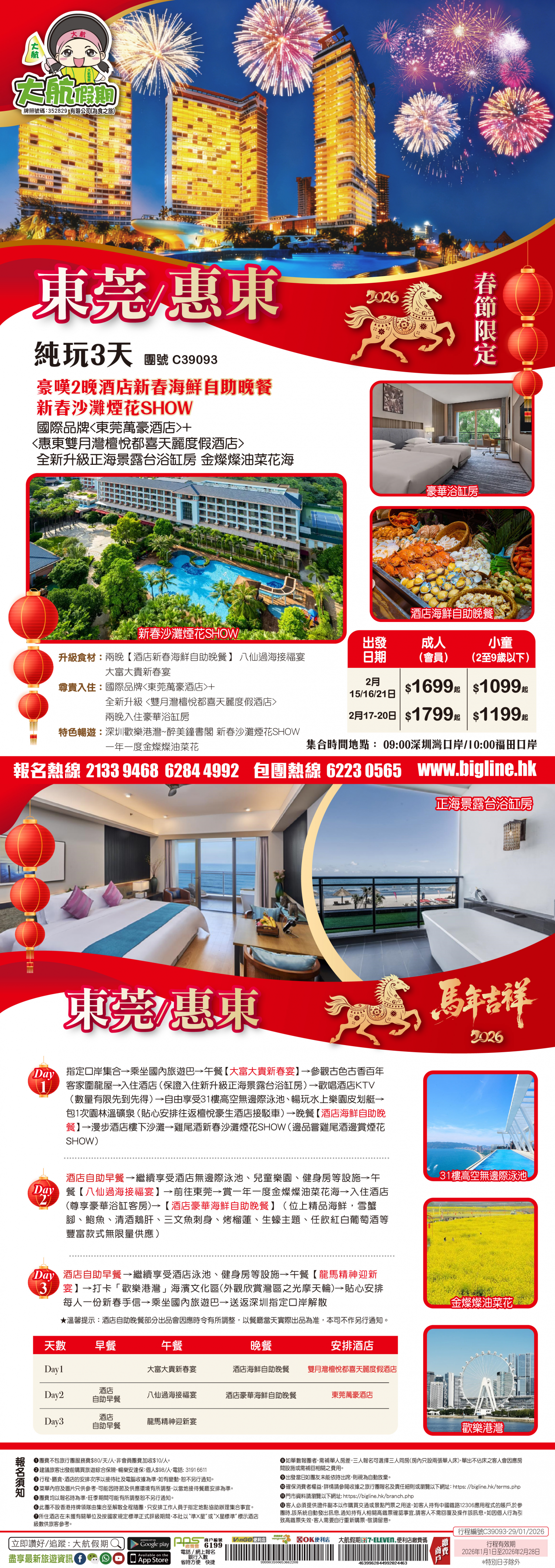 | 第1天 | 大富大貴新春宴 | 酒店自助晚餐 | 雙月灣檀悅都喜天麗度假酒店 | |