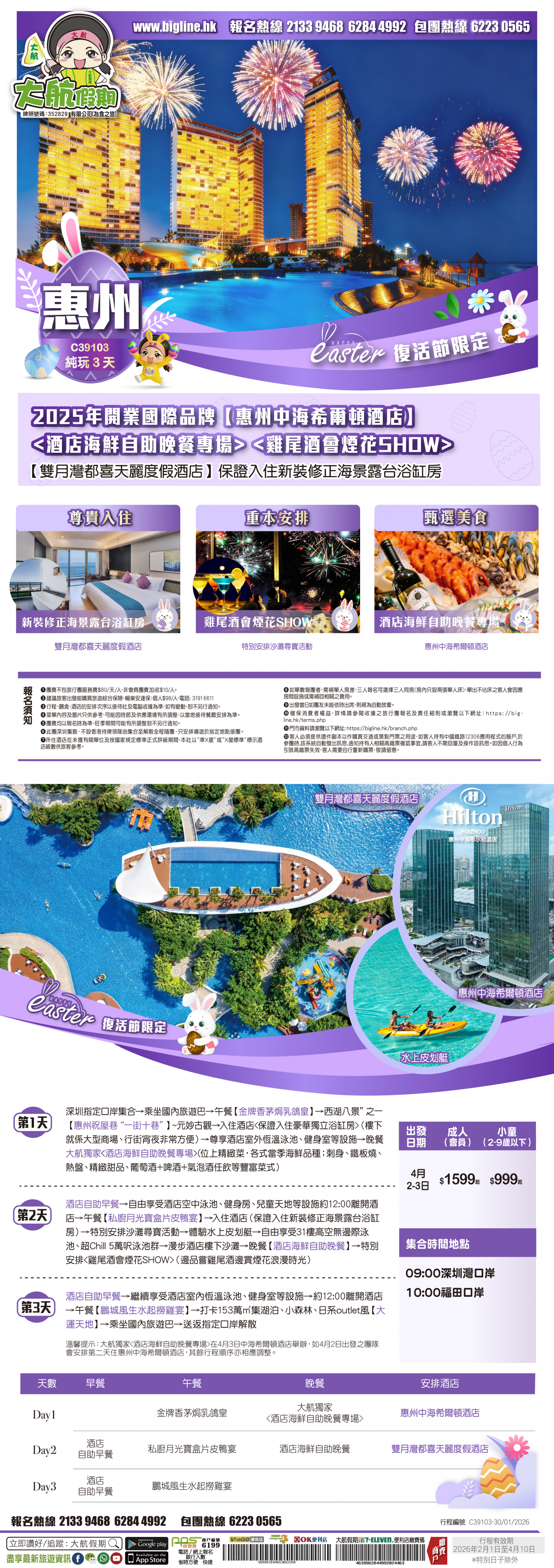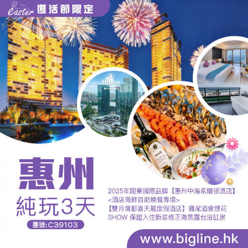 | 第1天 | 金牌香茅焗乳鴿皇 | 大航獨家<聖誕海鮮自助晚餐專場> | 惠州中海希爾頓酒店 | |