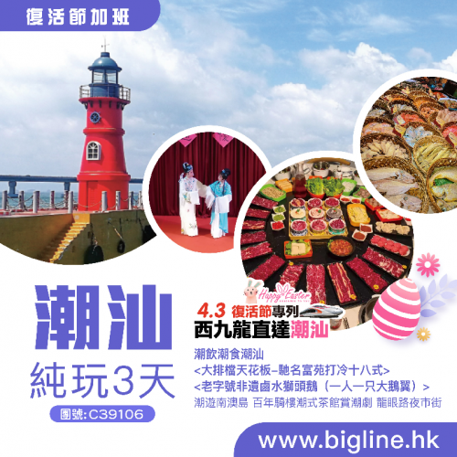 【4.3西九龍直達潮汕復活節專列】西九龍高鐵往返 潮飲潮食潮汕<馳名富苑打冷十八式><老字號非遺鹵水獅頭鵝>潮遊南澳島 百年騎樓潮式茶館賞潮劇 龍眼路夜市街 高鐵純玩3天
