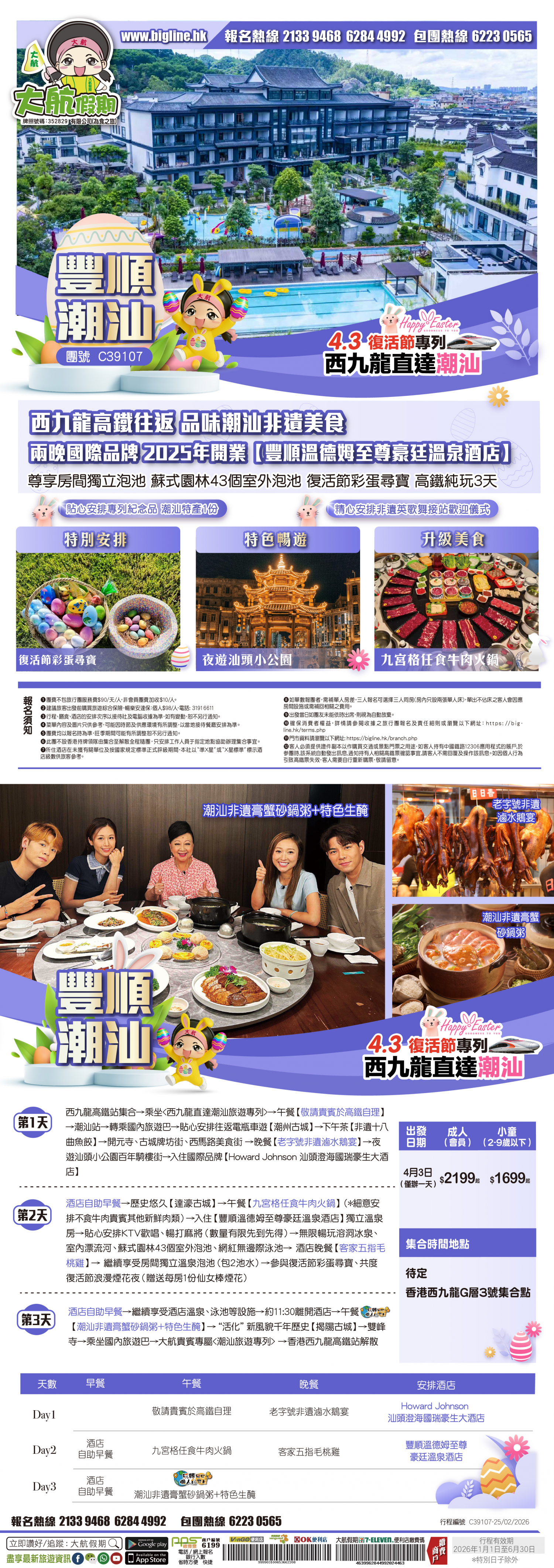 *團員繳付退票費後 (如適用): 1) 已繳款項可保留半年; 或 2) 選擇轉團後, 餘款則保留半年; 或 3) 可繳付『迫不得已理由』之手續費後, 取回已付餘款。 *個別機票+酒店套票產品如因『迫不得已理由』取消外遊行程, 處理旅客退款時亦按以上訂列收取每位退票費及手續費, 並以行程表 (套票單張) 所列為準。 責任細則: 1. 本公司保留合併團隊出發的權利。 2. 行程書或單張內所列費用根據當時機票價格及國際貨幣兌換率而訂立。外幣浮動等情況之下, 本公司保留在出發前調整各項費用的權利及徵收額外費用。 3. 所有列出的交通服務資料只供參考, 如有更改概不負責, 一切須以出票時為準。 4. 除本公司直接提供之服務外, 本公司及其職員或附屬公司或與本公司有經營關係之公司代理人身份在香港或外地安排其他獨立機構所提供之交通工具 (如飛機、輪船、火車、或遊覽巴士等) 、住宿、膳食或娛樂觀光項目等 (“委託機構”), 團員如遇交通延誤、行李遺失、意外傷亡或財物損失等, 該依照當地法律向擁有、管理或操作之委託機構直接交涉或追討賠償, 通常該等機構均各訂位不同條例, 以對客人負責。在此情況下, 本公司概不對該等損失或傷亡負責。 5. 除因由本公司之員工或其他直接管理或操作之機構之疏忽而引致團員之個人傷亡外, 本公司對團員在任何意外中之個人傷亡、經濟、娛樂或精神損失概不負責。 6. 除經本公司同意及安排, 如團員自行更改由其他人士代為參團, 本公司或其委託機構之職員有權取消其隨團之資格, 而無須發還任何團費, 而該人士在隨團期間之保險、責任賠償、行為後果等均由該人仕自行承擔。 7. 如因天氣、罷工、戰爭、怠工或安全情況影響而引致有關交通工具暫停服務, 停航或其他事故, 而必須將行程更改或取消部份行程, 本公司則將團員所繳交之費用扣除因以上事故而引致之損失後, 退回差額給團員。 8. 有關住宿、膳食、遊覽節目等問題, 均依據行程表安排, 行程先後次序有可能需要更改, 一切以當地安排為準。若遇特殊情況, 如簽證受阻, 當地酒店突告客滿或航機改變飛行時間或地點, 以及非本公司或其委託機構所能控制之因素, 令旅行團節目有增減, 或臨時更改交通工具、班機時間、機種及更換酒店等等, 本公司或其委託機構得依當時情況全權盡力處理, 團員不得藉故反對或退出, 因故取消之節目, 將不獲退還款項, 任何因延期而引致之額外支出, 本公司或其委託機構概不負責。 9. 所有酒店及住宿根據行程安排, 本公司視乎當時情形作出更改, 但不限於遇展覽會或特殊情況下, 將住宿鄰近城市之同等級酒店及住宿代替。本公司如因『迫不得已理由(外遊)』(即指戰爭、政治動盪、恐怖襲擊、天災、疫症、惡劣天氣、交通工具發生技術問題、載運機構臨時更改班次或取消服務、罷工、工業行動、旅遊目的地政府或世界衛生組織發出旅遊警示(警告)、香港特別行政區政府發出紅色或黑色外遊警示、不可抗力事件,以及業界不能控制的其他不利離開香港或在香港境外旅遊的情況)於外遊旅行團出發後更改任何項目而引致成本增加,可向顧客徵收額外費用。 10. 【已成團】代表該團號之指定出發日期預訂機位或已有足夠人數報名參加。但出發與否還受其他因素影響, 本公司保留最終決定權。 11. 任何團員在參與各項活動時, 如經常不遵守服飾人員之指引或安排, 在行動或言語上侮辱或滋擾其他團員或工作人員, 本公司或其委託機構職員有權視具體情況而取消其隨團資格而母須發任何團費, 而受該旅客監護之18歲以下同行團員亦須一併離開, 有關旅客離團後一切活動, 概與本公司或其委託機構無關。 12. 團員如欲於旅程完畢後延期返港, 須於出發前十四天提出, 以便本公司代為預定返港機位, 延期返港之機位, 未能即時作實, 團員不得藉此理由要求退出, 旅程完畢後延期逗留之費用, 概由團員自負。 13. 延期返港之團友, 必須在離境前七十二小時向航空公司確實回程機位, 任何機位如有變更, 概與本公司無關。 14. 團員如在旅途中自行離團或放棄行程, 離團後之責任自負, 一切後果與本公司或其委託機構無關。 15. 參團者須切實遵守各國及各地法例, 包括但不限於防疫防控條例, 並嚴禁攜帶違例物品出入境, 並照實申報攜帶之物品及現金。 16. 任何種類的簽證審批權及出入境批准權一律由該國或地區之領事館及/或出入境部門全權決定, 出入境如有問題, 責任旅客自負, 本公司或其委託機構母須負任何責任。如簽證已代辦, 簽證費恕不退還。 17. 即使團員持有效之入境簽證及旅遊證件, 而於入境時被當值之移民局海關人員拒絕入境, 本公司或其委託機構亦無須負任何責任。所需額外安排之食宿、交通費用、全部由其本人負責, 其餘下的行程亦將不會獲得任何補償, 亦不得要求退款或改團。 18. 中國內地相關法規規定, 即日起旅客入住中國內地境內酒店時, 公安機關會透過酒店前台向旅客一併採集人像信息資訊。 19. 如出現一些非本公司能力範圍可控制之問題 (如花卉、紅葉提早凋謝或景觀、自然現象、景點活動或戶外項目) 會受天氣等因素影響, 如未能安排則取消不作任何退款安排。 20. 旅客如在旅程中確診 COVID-19或其他傳染病,無論受到當地政府隔離或其他檢疫要求影響與否,為確保其他旅客之安全,確診旅
