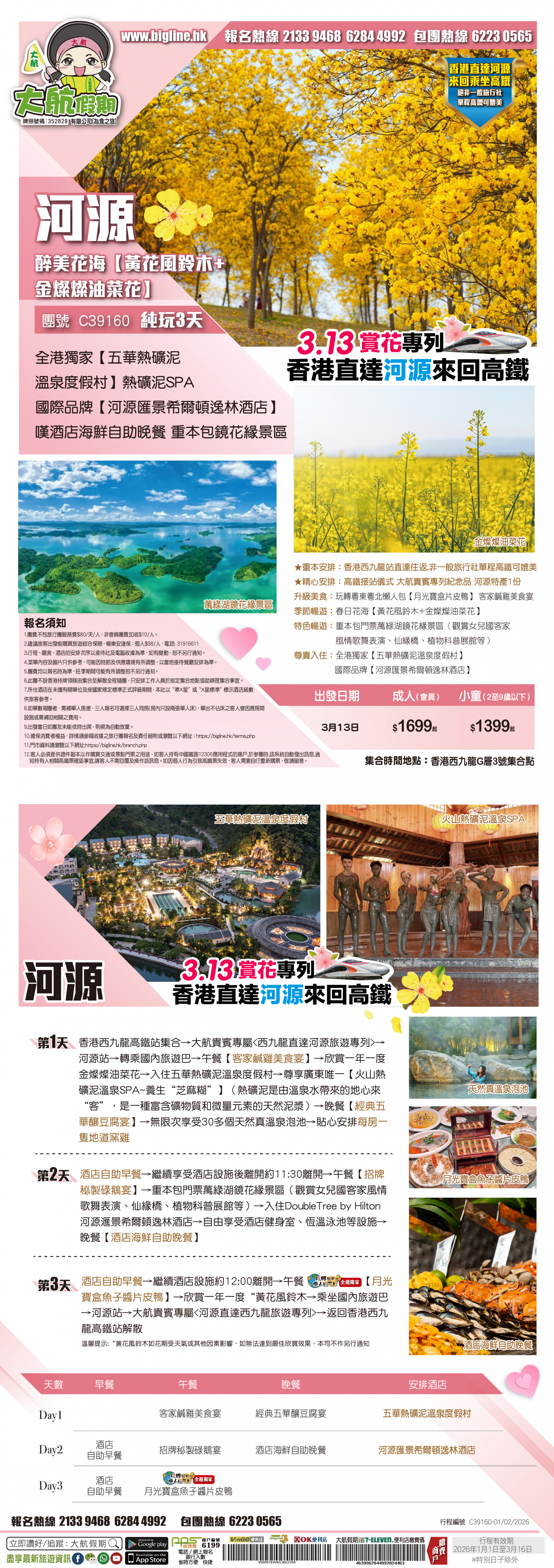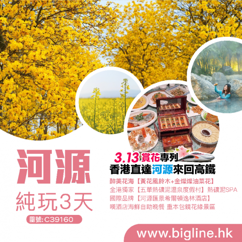 【3.13香港直達河源高鐵賞花專列】醉美花海【黃花風鈴木+金燦燦油菜花】全港獨家【五華熱礦泥溫泉度假村】熱礦泥SPA+國際品牌【河源匯景希爾頓逸林酒店】嘆酒店海鮮自助晚餐 純玩3天