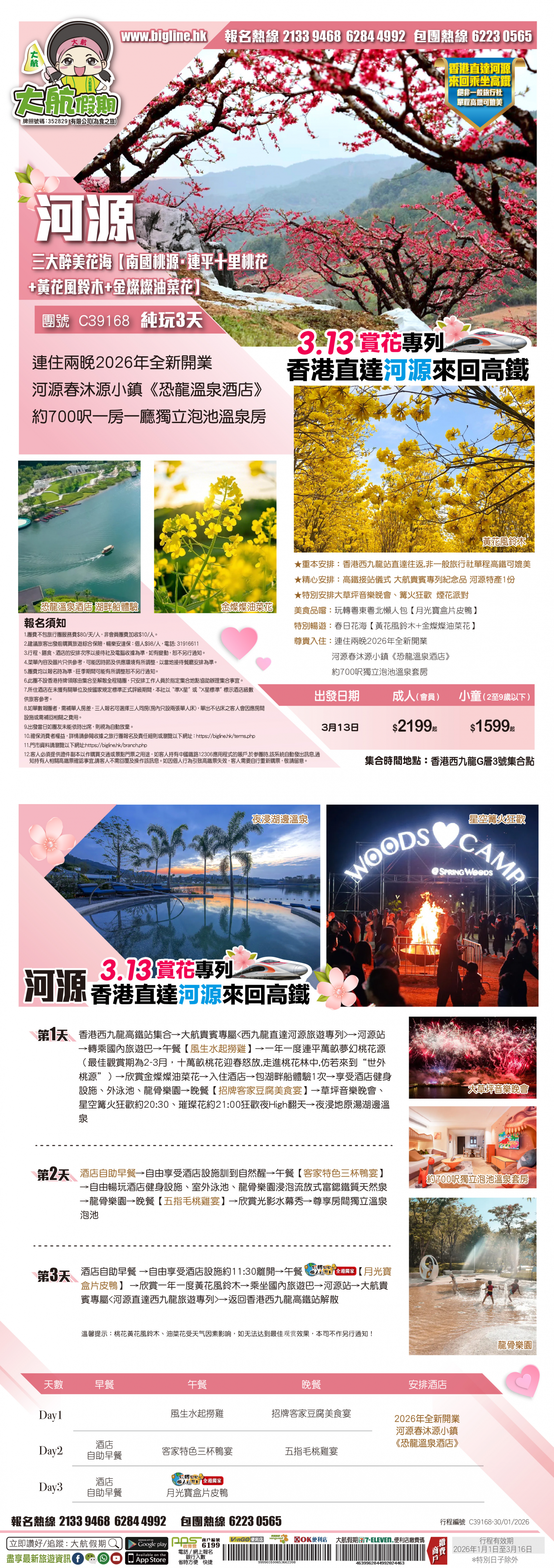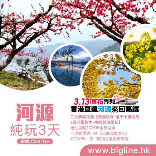 【3.13香港直達河源高鐵賞花專列】醉美花海【黃花風鈴木+金燦燦油菜花】全港獨家【五華熱礦泥溫泉度假村】熱礦泥SPA+國際品牌【河源匯景希爾頓逸林酒店】嘆酒店海鮮自助晚餐 純玩3天