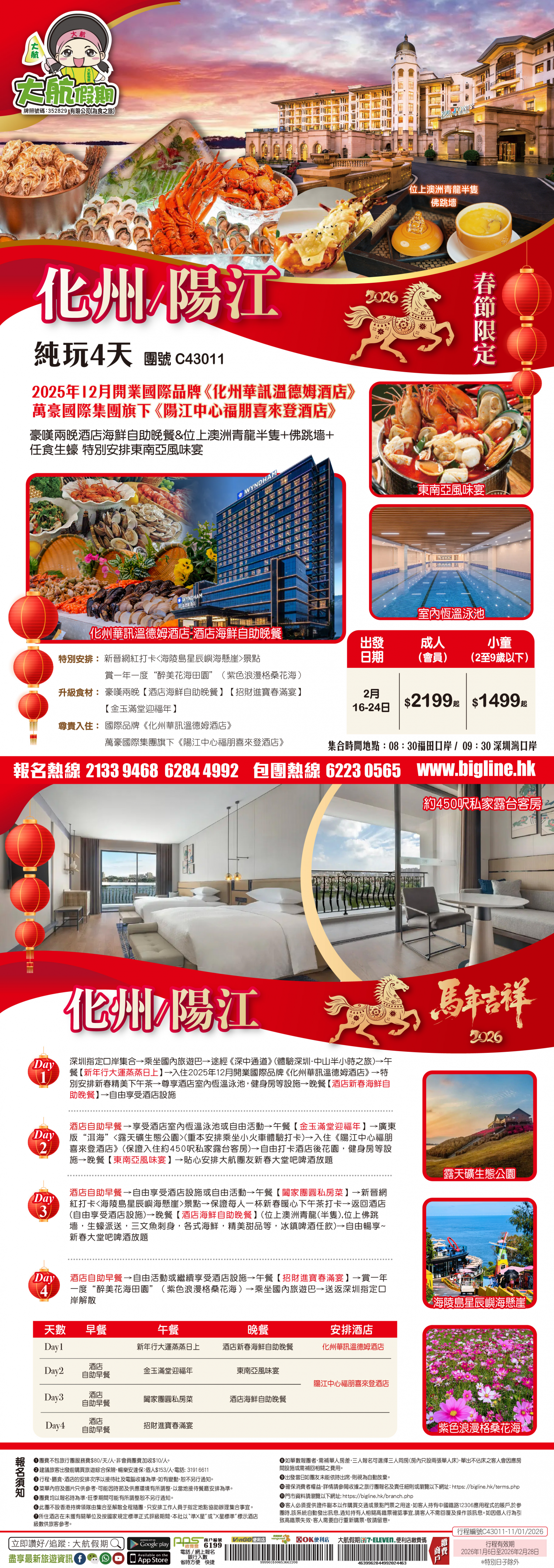 | 第1天 | 新年行大運蒸蒸日上 | 酒店海鮮自助晚餐 | 化州華訊溫德姆酒店 | |