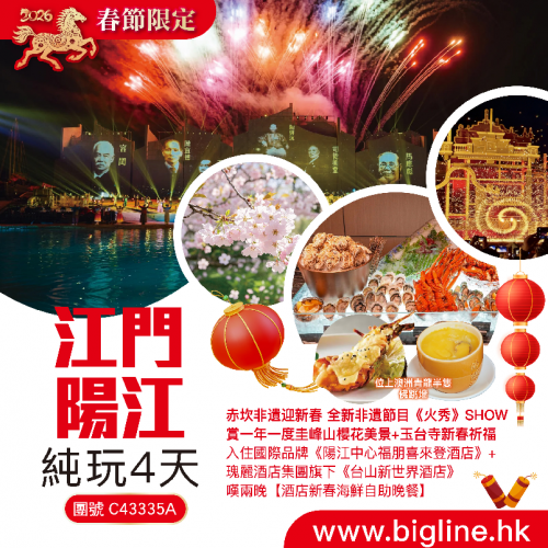 【春節限定】赤坎非遺迎新春 全新非遺節目《火秀》SHOW 賞一年一度櫻花美景+玉台寺新春祈福 入住國際品牌《江門保利皇冠假日酒店》+瑰麗酒店集團旗下《台山新世界酒店》嘆【酒店新春海鮮自助晚餐】純玩4天