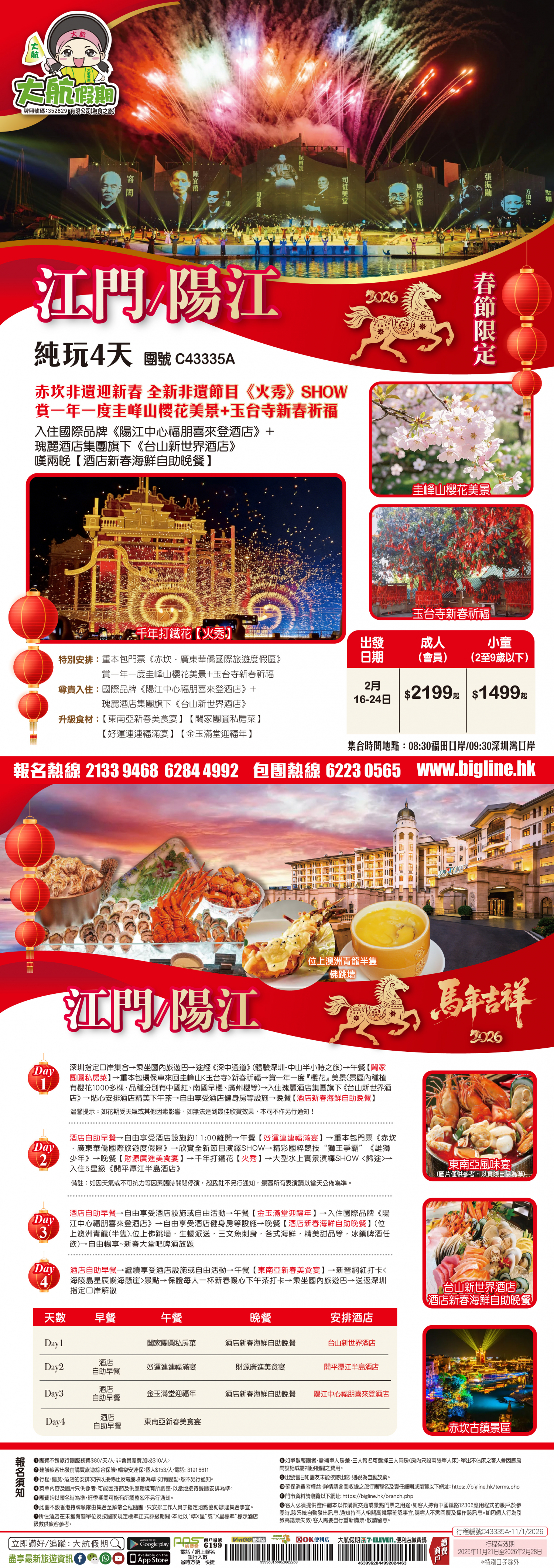 | 第1天 | 闔家團圓私房菜 | 酒店新春海鮮自助晚餐 | 台山新世界酒店 | |