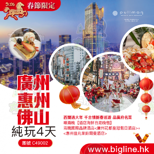 【春節限定】兩晚國際品牌 【惠州佳兆業鉑爾曼酒店】+【東莞松山湖華美達廣場酒店】 嘆兩晚酒店新春海鮮自助晚餐 一年一度金燦燦油菜花 夜遊打卡【一年一度西湖迎春燈會】純玩3天