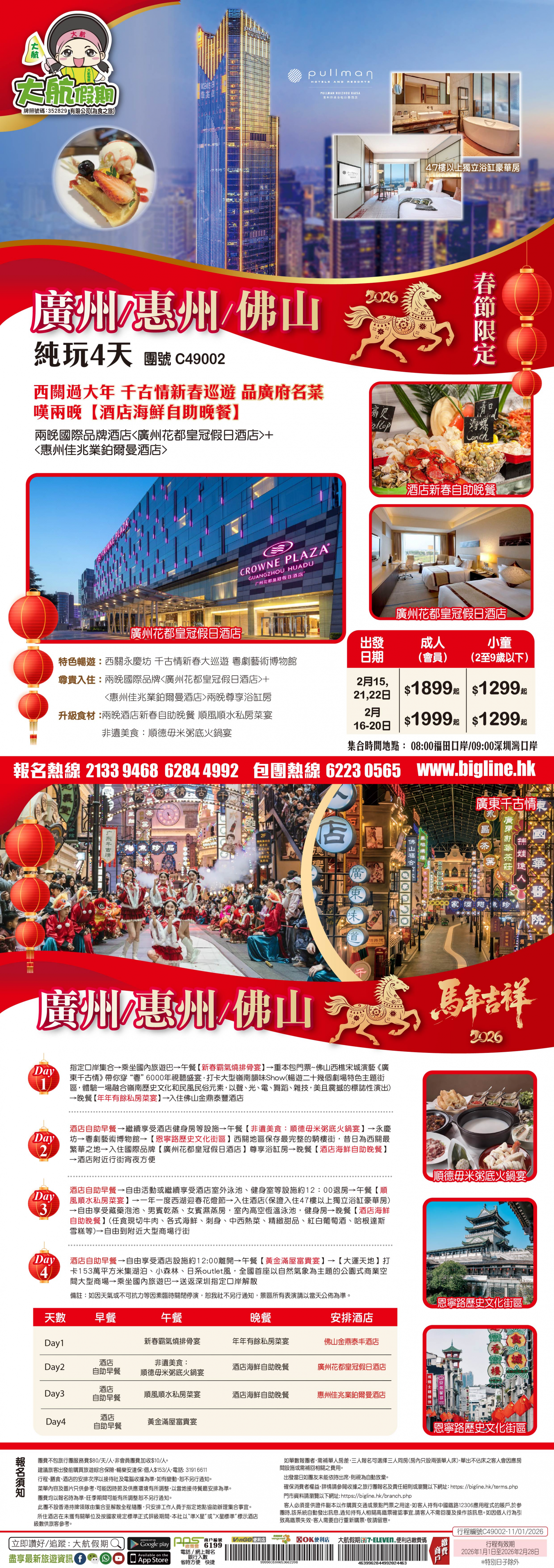 | 第2天 | 酒店自助早餐 | 非遺美食:順德毋米粥底火鍋宴 | 酒店海鮮自助晚餐 | 廣州花都皇冠假日酒店 |