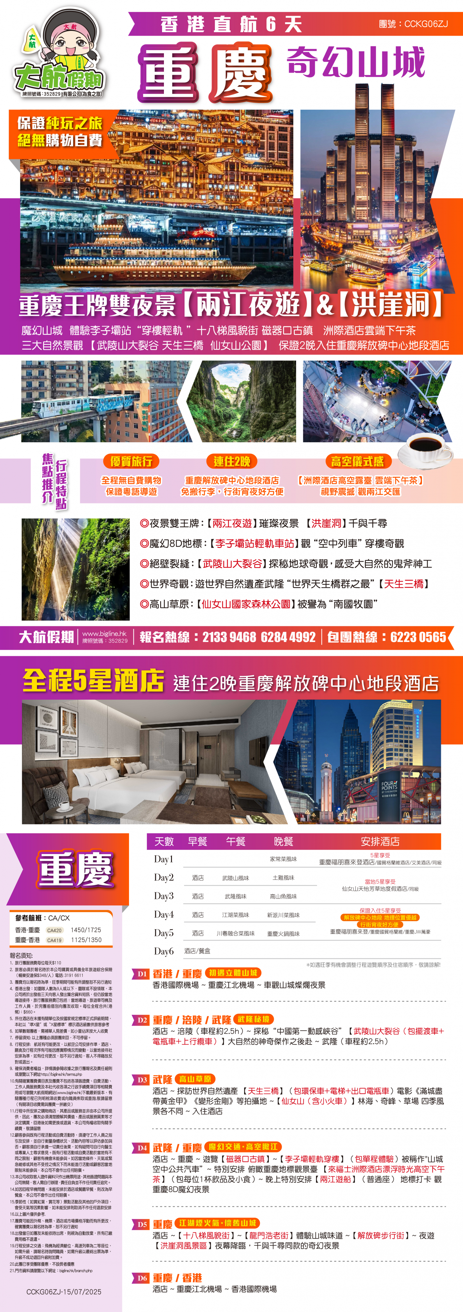 保證粵語導遊#重慶王牌雙夜景【兩江夜遊&洪崖洞】 李子壩“穿樓輕軌 ”十八梯風貌街 【武陵山大裂谷 天生三橋 仙女山】<洲際酒店雲端下午茶> 2晚住重慶解放碑中心地段酒店直航6天