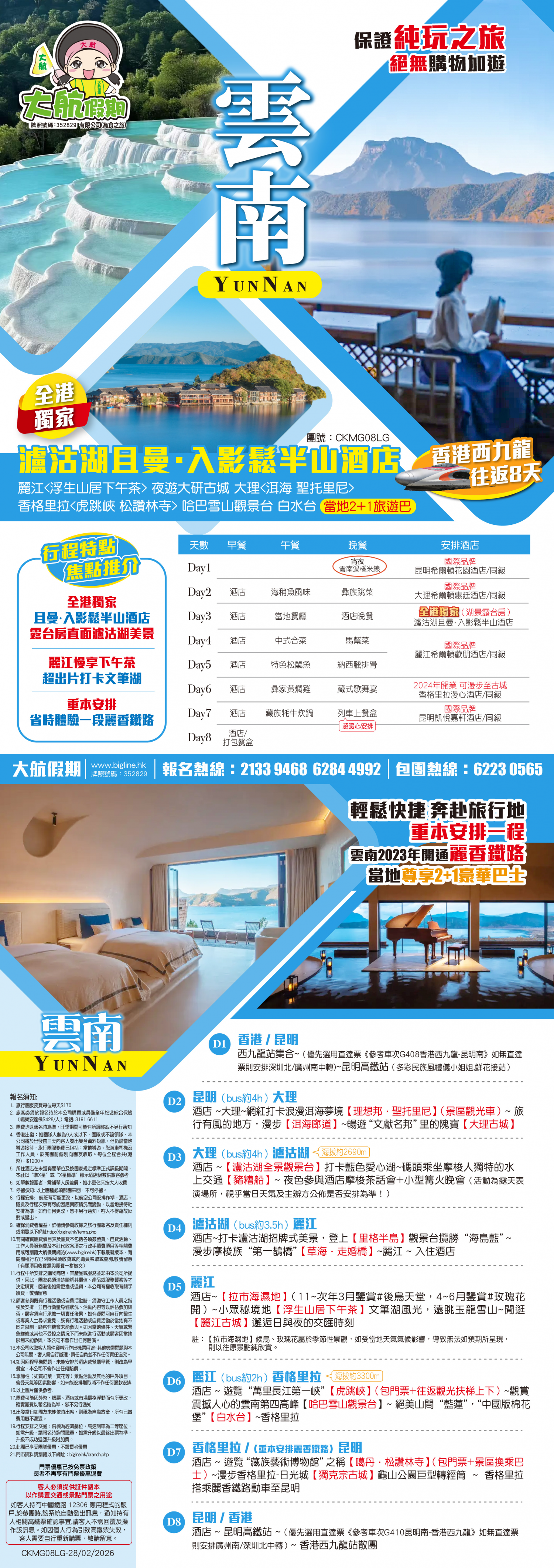 *團員繳付退票費後 (如適用): 1) 已繳款項可保留半年; 或 2) 選擇轉團後, 餘款則保留半年; 或 3) 可繳付『迫不得已理由』之手續費後, 取回已付餘款。 *個別機票+酒店套票產品如因『迫不得已理由』取消外遊行程, 處理旅客退款時亦按以上訂列收取每位退票費及手續費, 並以行程表 (套票單張) 所列為準。 責任細則: 1. 本公司保留合併團隊出發的權利。 2. 行程書或單張內所列費用根據當時機票價格及國際貨幣兌換率而訂立。外幣浮動等情況之下, 本公司保留在出發前調整各項費用的權利及徵收額外費用。 3. 所有列出的交通服務資料只供參考, 如有更改概不負責, 一切須以出票時為準。 4. 除本公司直接提供之服務外, 本公司及其職員或附屬公司或與本公司有經營關係之公司代理人身份在香港或外地安排其他獨立機構所提供之交通工具 (如飛機、輪船、火車、或遊覽巴士等) 、住宿、膳食或娛樂觀光項目等 (“委託機構”), 團員如遇交通延誤、行李遺失、意外傷亡或財物損失等, 該依照當地法律向擁有、管理或操作之委託機構直接交涉或追討賠償, 通常該等機構均各訂位不同條例, 以對客人負責。在此情況下, 本公司概不對該等損失或傷亡負責。 5. 除因由本公司之員工或其他直接管理或操作之機構之疏忽而引致團員之個人傷亡外, 本公司對團員在任何意外中之個人傷亡、經濟、娛樂或精神損失概不負責。 6. 除經本公司同意及安排, 如團員自行更改由其他人士代為參團, 本公司或其委託機構之職員有權取消其隨團之資格, 而無須發還任何團費, 而該人士在隨團期間之保險、責任賠償、行為後果等均由該人仕自行承擔。 7. 如因天氣、罷工、戰爭、怠工或安全情況影響而引致有關交通工具暫停服務, 停航或其他事故, 而必須將行程更改或取消部份行程, 本公司則將團員所繳交之費用扣除因以上事故而引致之損失後, 退回差額給團員。 8. 有關住宿、膳食、遊覽節目等問題, 均依據行程表安排, 行程先後次序有可能需要更改, 一切以當地安排為準。若遇特殊情況, 如簽證受阻, 當地酒店突告客滿或航機改變飛行時間或地點, 以及非本公司或其委託機構所能控制之因素, 令旅行團節目有增減, 或臨時更改交通工具、班機時間、機種及更換酒店等等, 本公司或其委託機構得依當時情況全權盡力處理, 團員不得藉故反對或退出, 因故取消之節目, 將不獲退還款項, 任何因延期而引致之額外支出, 本公司或其委託機構概不負責。 9. 所有酒店及住宿根據行程安排, 本公司視乎當時情形作出更改, 但不限於遇展覽會或特殊情況下, 將住宿鄰近城市之同等級酒店及住宿代替。本公司如因『迫不得已理由(外遊)』(即指戰爭、政治動盪、恐怖襲擊、天災、疫症、惡劣天氣、交通工具發生技術問題、載運機構臨時更改班次或取消服務、罷工、工業行動、旅遊目的地政府或世界衛生組織發出旅遊警示(警告)、香港特別行政區政府發出紅色或黑色外遊警示、不可抗力事件,以及業界不能控制的其他不利離開香港或在香港境外旅遊的情況)於外遊旅行團出發後更改任何項目而引致成本增加,可向顧客徵收額外費用。 10. 【已成團】代表該團號之指定出發日期預訂機位或已有足夠人數報名參加。但出發與否還受其他因素影響, 本公司保留最終決定權。 11. 任何團員在參與各項活動時, 如經常不遵守服飾人員之指引或安排, 在行動或言語上侮辱或滋擾其他團員或工作人員, 本公司或其委託機構職員有權視具體情況而取消其隨團資格而母須發任何團費, 而受該旅客監護之18歲以下同行團員亦須一併離開, 有關旅客離團後一切活動, 概與本公司或其委託機構無關。 12. 團員如欲於旅程完畢後延期返港, 須於出發前十四天提出, 以便本公司代為預定返港機位, 延期返港之機位, 未能即時作實, 團員不得藉此理由要求退出, 旅程完畢後延期逗留之費用, 概由團員自負。 13. 延期返港之團友, 必須在離境前七十二小時向航空公司確實回程機位, 任何機位如有變更, 概與本公司無關。 14. 團員如在旅途中自行離團或放棄行程, 離團後之責任自負, 一切後果與本公司或其委託機構無關。 15. 參團者須切實遵守各國及各地法例, 包括但不限於防疫防控條例, 並嚴禁攜帶違例物品出入境, 並照實申報攜帶之物品及現金。 16. 任何種類的簽證審批權及出入境批准權一律由該國或地區之領事館及/或出入境部門全權決定, 出入境如有問題, 責任旅客自負, 本公司或其委託機構母須負任何責任。如簽證已代辦, 簽證費恕不退還。 17. 即使團員持有效之入境簽證及旅遊證件, 而於入境時被當值之移民局海關人員拒絕入境, 本公司或其委託機構亦無須負任何責任。所需額外安排之食宿、交通費用、全部由其本人負責, 其餘下的行程亦將不會獲得任何補償, 亦不得要求退款或改團。 18. 中國內地相關法規規定, 即日起旅客入住中國內地境內酒店時, 公安機關會透過酒店前台向旅客一併採集人像信息資訊。 19. 如出現一些非本公司能力範圍可控制之問題 (如花卉、紅葉提早凋謝或景觀、自然現象、景點活動或戶外項目) 會受天氣等因素影響, 如未能安排則取消不作任何退款安排。 20. 旅客如在旅程中確診 COVID-19或其他傳染病,無論受到當地政府隔離或其他檢疫要求影響與否,為確保其他旅客之安全,確診旅
