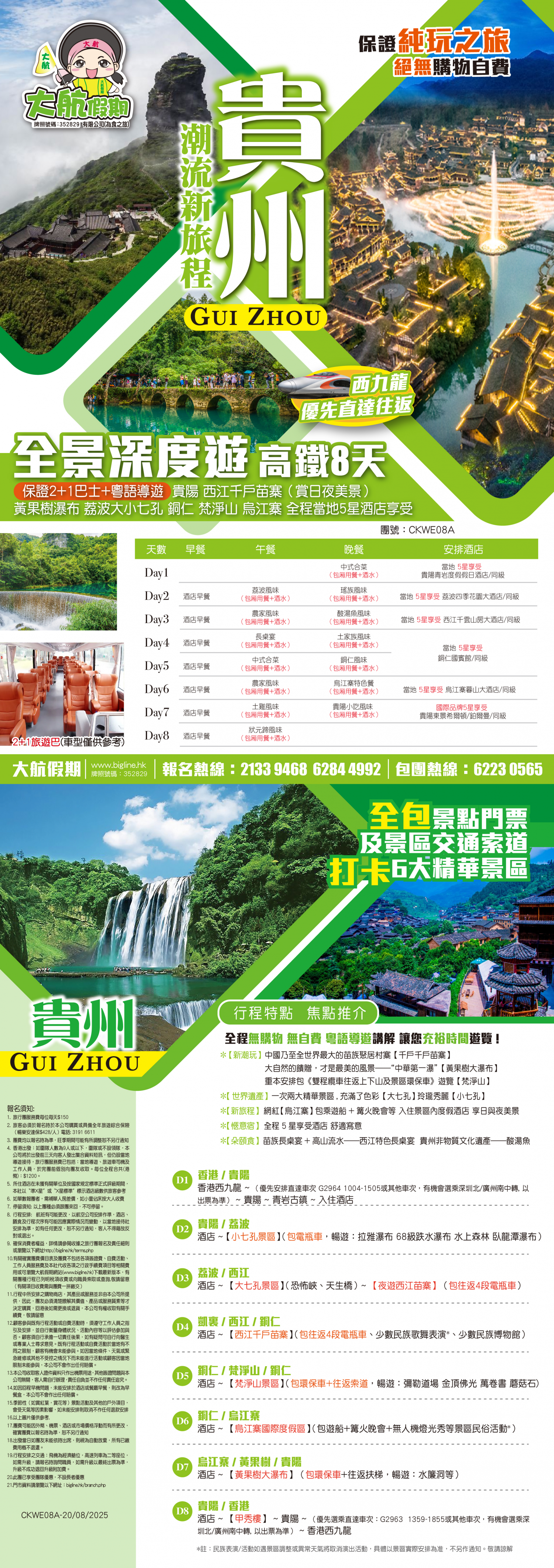 【貴州潮流新旅程】《保證2+1巴士+粵語導遊》貴陽 西江千戶苗寨(賞日夜美景) 黃果樹瀑布 荔波 大小七孔 銅仁 梵淨山 烏江寨 全程5星酒店享受深度遊高鐵8天