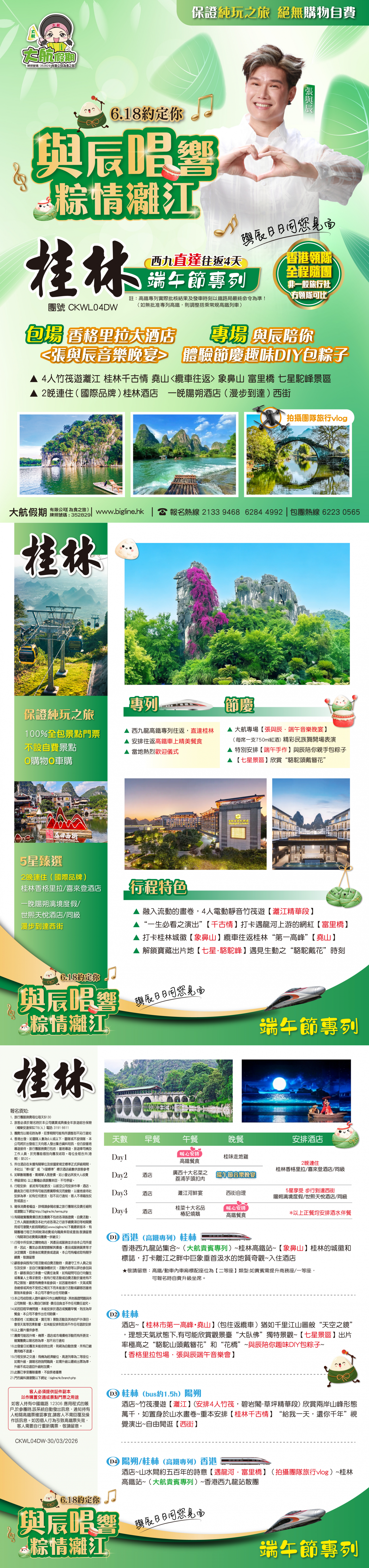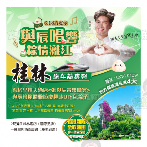 酒店~【桂林市第一高峰・堯山】(包往返纜車)猶如千里江山圖般“天空之鏡”,理想天氣狀態下,有可能欣賞觀景臺“大臥佛”獨特景觀~【七星駝峰】出片率極高之“駱駝山頭戴簪花”和“花橋”~與辰陪你趣味DIY包粽子~【香格里拉包場·張與辰端午音樂會】