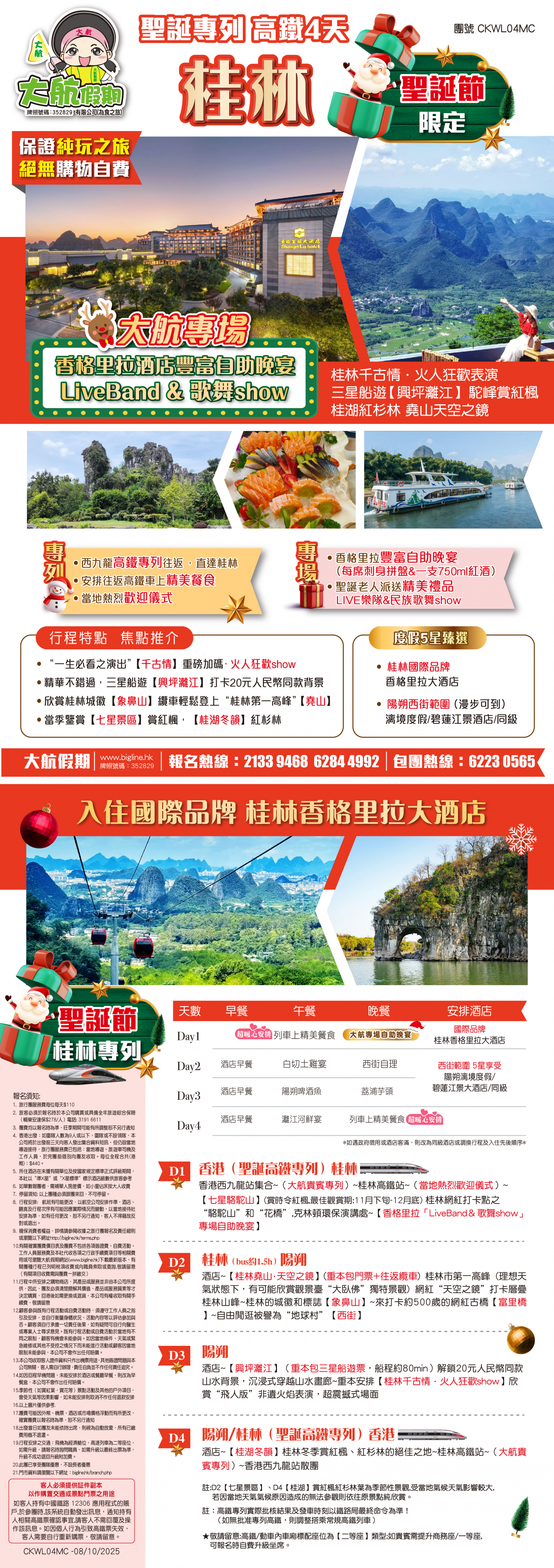 聖誕節#香港桂林高鐵專列【大航專場 香格里拉「LiveBand & 歌舞show」豐富自助晚宴】千古情·火人狂歡秀 三星船遊(興坪灕江) 堯山"天空之鏡" 象鼻山 2晚連住西街範圍酒店 高鐵4天