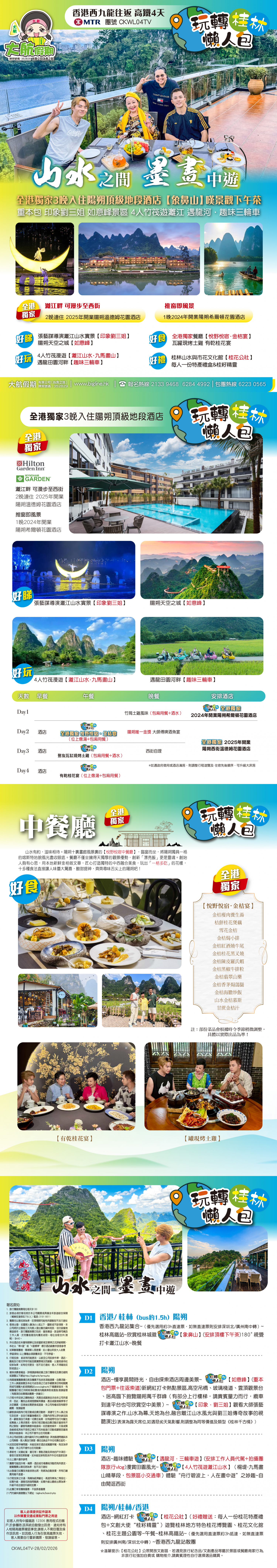 【4人成團 私人專屬旅行 包服務費】玩轉桂林懶人包「全港獨家:2晚連住陽朔途易藍酒店 陽朔雲端攝影基地」 (4人竹筏遊 千里江山圖 山水列車 夜遊"巨龍巡遊" 象鼻山觀景下午茶 西街)西九龍往返4天