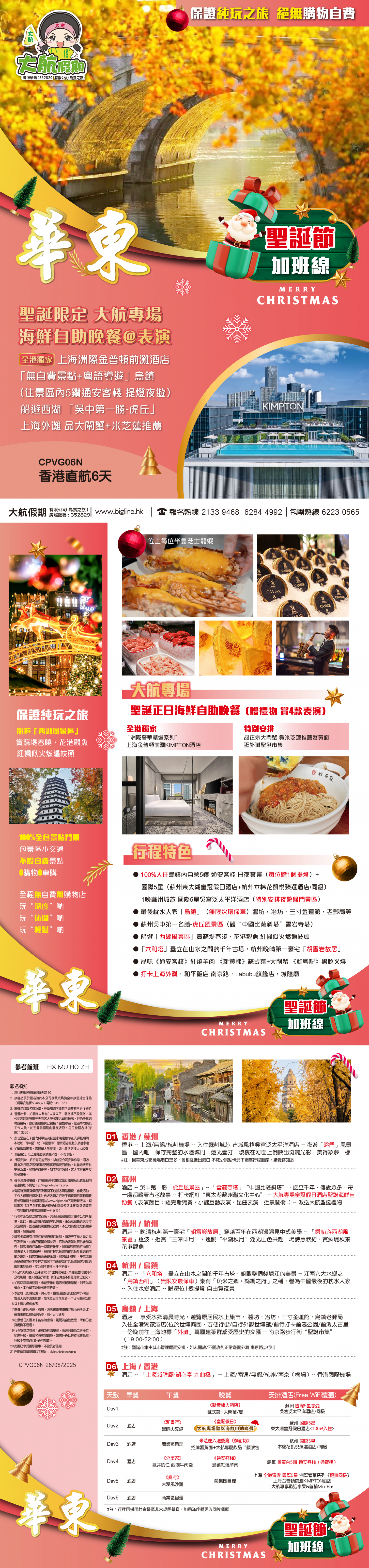 .酒店 -- 吳中第一勝「虎丘風景區」-- 「雲巖寺塔」“中國比薩斜塔”,屹立千年,傳說眾多,每一處都藏著古老故事 -- 打卡網紅“東太湖蘇州灣文化中心” -- 大航專場皇冠假日酒店聖誕海鮮自助餐(表演節目:薩克斯獨奏,小醜互動表演,3.昆曲表演,近景魔術互動)-- 派送大航聖誕禮物