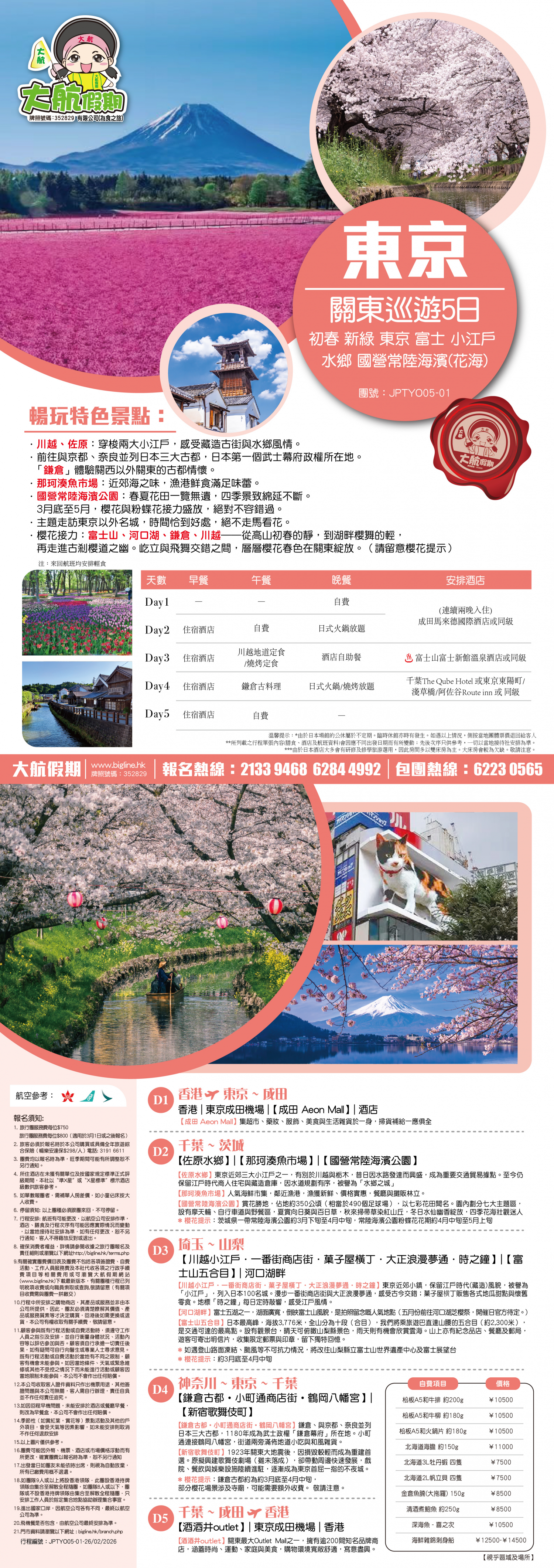*團員繳付退票費後 (如適用): 1) 已繳款項可保留半年; 或 2) 選擇轉團後, 餘款則保留半年; 或 3) 可繳付『迫不得已理由』之手續費後, 取回已付餘款。 *個別機票+酒店套票產品如因『迫不得已理由』取消外遊行程, 處理旅客退款時亦按以上訂列收取每位退票費及手續費, 並以行程表 (套票單張) 所列為準。 責任細則: 1. 本公司保留合併團隊出發的權利。 2. 行程書或單張內所列費用根據當時機票價格及國際貨幣兌換率而訂立。外幣浮動等情況之下, 本公司保留在出發前調整各項費用的權利及徵收額外費用。 3. 所有列出的交通服務資料只供參考, 如有更改概不負責, 一切須以出票時為準。 4. 除本公司直接提供之服務外, 本公司及其職員或附屬公司或與本公司有經營關係之公司代理人身份在香港或外地安排其他獨立機構所提供之交通工具 (如飛機、輪船、火車、或遊覽巴士等) 、住宿、膳食或娛樂觀光項目等 (“委託機構”), 團員如遇交通延誤、行李遺失、意外傷亡或財物損失等, 該依照當地法律向擁有、管理或操作之委託機構直接交涉或追討賠償, 通常該等機構均各訂位不同條例, 以對客人負責。在此情況下, 本公司概不對該等損失或傷亡負責。 5. 除因由本公司之員工或其他直接管理或操作之機構之疏忽而引致團員之個人傷亡外, 本公司對團員在任何意外中之個人傷亡、經濟、娛樂或精神損失概不負責。 6. 除經本公司同意及安排, 如團員自行更改由其他人士代為參團, 本公司或其委託機構之職員有權取消其隨團之資格, 而無須發還任何團費, 而該人士在隨團期間之保險、責任賠償、行為後果等均由該人仕自行承擔。 7. 如因天氣、罷工、戰爭、怠工或安全情況影響而引致有關交通工具暫停服務, 停航或其他事故, 而必須將行程更改或取消部份行程, 本公司則將團員所繳交之費用扣除因以上事故而引致之損失後, 退回差額給團員。 8. 有關住宿、膳食、遊覽節目等問題, 均依據行程表安排, 行程先後次序有可能需要更改, 一切以當地安排為準。若遇特殊情況, 如簽證受阻, 當地酒店突告客滿或航機改變飛行時間或地點, 以及非本公司或其委託機構所能控制之因素, 令旅行團節目有增減, 或臨時更改交通工具、班機時間、機種及更換酒店等等, 本公司或其委託機構得依當時情況全權盡力處理, 團員不得藉故反對或退出, 因故取消之節目, 將不獲退還款項, 任何因延期而引致之額外支出, 本公司或其委託機構概不負責。 9. 所有酒店及住宿根據行程安排, 本公司視乎當時情形作出更改, 但不限於遇展覽會或特殊情況下, 將住宿鄰近城市之同等級酒店及住宿代替。本公司如因『迫不得已理由(外遊)』(即指戰爭、政治動盪、恐怖襲擊、天災、疫症、惡劣天氣、交通工具發生技術問題、載運機構臨時更改班次或取消服務、罷工、工業行動、旅遊目的地政府或世界衛生組織發出旅遊警示(警告)、香港特別行政區政府發出紅色或黑色外遊警示、不可抗力事件,以及業界不能控制的其他不利離開香港或在香港境外旅遊的情況)於外遊旅行團出發後更改任何項目而引致成本增加,可向顧客徵收額外費用。 10. 【已成團】代表該團號之指定出發日期預訂機位或已有足夠人數報名參加。但出發與否還受其他因素影響, 本公司保留最終決定權。 11. 任何團員在參與各項活動時, 如經常不遵守服飾人員之指引或安排, 在行動或言語上侮辱或滋擾其他團員或工作人員, 本公司或其委託機構職員有權視具體情況而取消其隨團資格而母須發任何團費, 而受該旅客監護之18歲以下同行團員亦須一併離開, 有關旅客離團後一切活動, 概與本公司或其委託機構無關。 12. 團員如欲於旅程完畢後延期返港, 須於出發前十四天提出, 以便本公司代為預定返港機位, 延期返港之機位, 未能即時作實, 團員不得藉此理由要求退出, 旅程完畢後延期逗留之費用, 概由團員自負。 13. 延期返港之團友, 必須在離境前七十二小時向航空公司確實回程機位, 任何機位如有變更, 概與本公司無關。 14. 團員如在旅途中自行離團或放棄行程, 離團後之責任自負, 一切後果與本公司或其委託機構無關。 15. 參團者須切實遵守各國及各地法例, 包括但不限於防疫防控條例, 並嚴禁攜帶違例物品出入境, 並照實申報攜帶之物品及現金。 16. 任何種類的簽證審批權及出入境批准權一律由該國或地區之領事館及/或出入境部門全權決定, 出入境如有問題, 責任旅客自負, 本公司或其委託機構母須負任何責任。如簽證已代辦, 簽證費恕不退還。 17. 即使團員持有效之入境簽證及旅遊證件, 而於入境時被當值之移民局海關人員拒絕入境, 本公司或其委託機構亦無須負任何責任。所需額外安排之食宿、交通費用、全部由其本人負責, 其餘下的行程亦將不會獲得任何補償, 亦不得要求退款或改團。 18. 中國內地相關法規規定, 即日起旅客入住中國內地境內酒店時, 公安機關會透過酒店前台向旅客一併採集人像信息資訊。 19. 如出現一些非本公司能力範圍可控制之問題 (如花卉、紅葉提早凋謝或景觀、自然現象、景點活動或戶外項目) 會受天氣等因素影響, 如未能安排則取消不作任何退款安排。 20. 旅客如在旅程中確診 COVID-19或其他傳染病,無論受到當地政府隔離或其他檢疫要求影響與否,為確保其他旅客之安全,確診旅