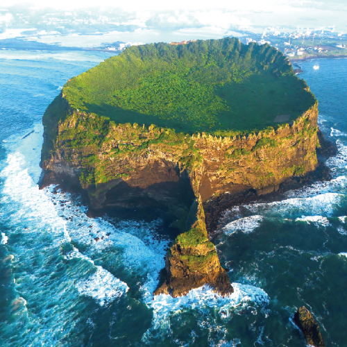 城山日出峰~海拔高180公尺,是5,000年前濟州島眾多火山噴發口中罕見地於海中爆發形成的火山體。熔岩與水混合引起火山爆發,熔岩碎成細細的火山灰,堆積在火山噴發口周邊形成圓錐型。城山日出峰原本是火山島,但因新陽海水浴場的土地與島間的沙子、碎石堆積,使火山島與陸地相連,而呈現今日的樣貌。