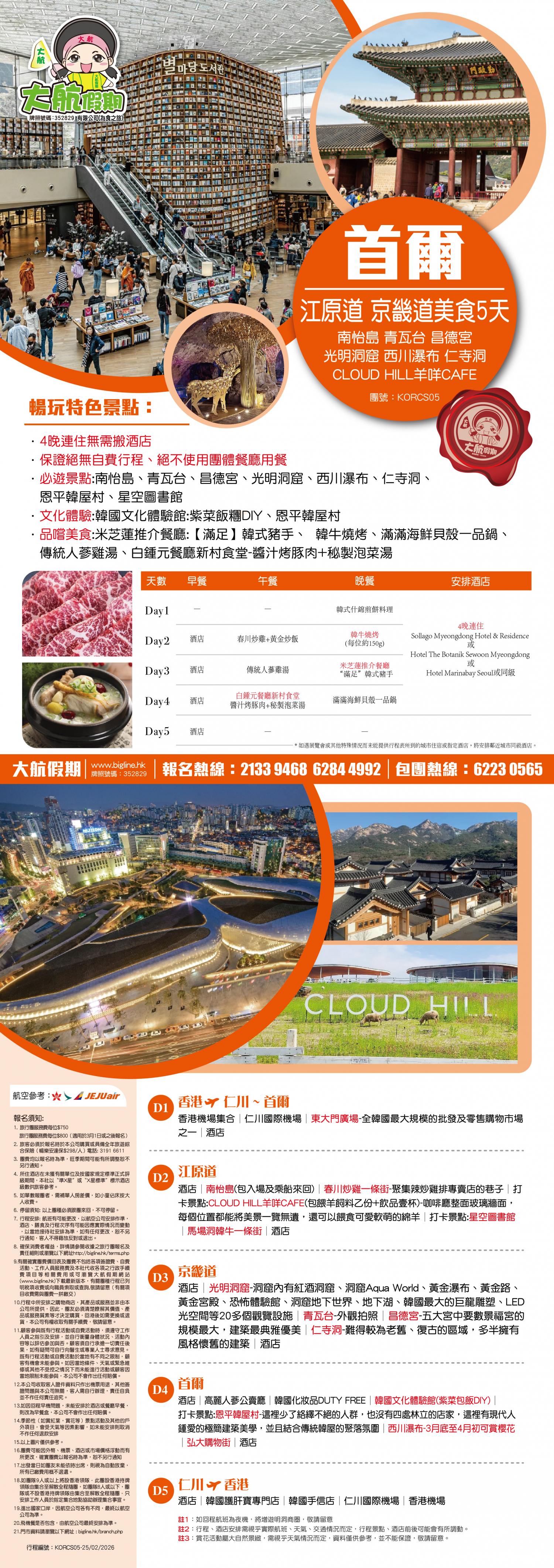 酒店│南怡島(包入場及乘船來回)-3月底至4月初可賞櫻花│春川炒雞一條街-聚集辣炒雞排專賣店的巷子│打卡景點:CLOUD HILL羊咩CAFE(包餵羊飼料乙份+飲品壹杯)-咖啡廳整面玻璃牆面,每個位置都能將美景一覽無遺,還可以餵食可愛軟萌的綿羊│打卡景點:星空圖書館│馬場洞韓牛一條街│酒店