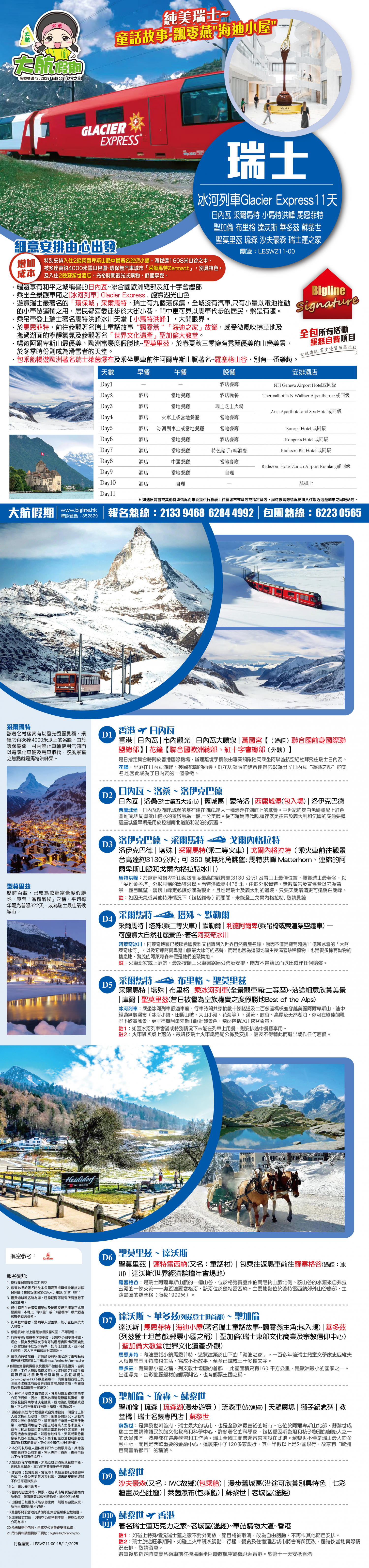 6. 團費及其他相關費用包括但不限於:稅項、機場保安費、旅行團服務費、郵輪服務費、旅遊保險的保費、有關簽證及其相關費用(包括但不限於簽證費及代辦簽證的服務費/手續費)須在出發前21天繳清, 長線則為30天前 (旺季期間須在出發前30天繳付, 長線則為 45天前), 個別線路亦將因應不同供應商之經營條件而作出調整,以該團的單張資料為準; 逾期未清繳費用者, 本公司得將訂位作廢, 所繳訂金例不發還, 亦不得將訂金轉予他人或轉用於其他日子出發及其他旅行團。 7. 付款方式以各訂購渠道之系統可接受為準。 8. 所有一切代收之款項,包括但不限於燃油附加費、香港及各地機場稅和機場建設稅等, 本公司只接受以現金或易辦事繳付所有代收費用。 - 信用卡/分期付款計劃或銀聯卡付款, 以銀行確認成功過賬, 方可作實。 - 請保留收據, 以作退款之憑據, 如以信用卡免息分期或銀聯卡付款, 則退款必須經由銀行辦理手續, 退回該信用卡/銀行戶口, 需時最少約三十五個工作天, 退款時間及一切有關條款均由信用卡公司決定。 9. 鑑於外幣浮動、因燃油附加費的浮動以致機票成本增加、或因事前未能預見的情況(包括但不限於交通票、酒店、保險等方面)導致成本上升, 本公司保留權利在顧客繳付全部團費及其他相關費用前向有關顧客徵收額外費用。價格如有更改, 將會另行通知。燃油附加費價格以航空公司最後公佈為準。一切費用必須於出發前全數繳付。受影響的顧客在無損其法律權利和責任的原則下,可選擇支付該額外費用以繼續參加該旅行團,或於該旅行團出發前選擇退出。如屬後者,本公司將於發出徵收額外費用通知後的七個工作日內(發出通知當日不計)或於顧客選擇退出該旅行團後的七個工作日內(顧客退出當日不計)(以較後發生者為準)退還或(如顧客以信用卡繳付款項)安排退還顧客所付的款項。 10. 減免折扣優惠, 必須於報名時申請及提供證明予本公司, 概不補發。 11. 當地參團之團費不設任何優惠。團員亦須自備國際機票、所有內陸機票及個別路線之部份交通安排。 12. 本公司收費上的年齡定義 : 0至23 個月為嬰兒; 2至11歲為小童 (根據不同線路釐定小童的年齡定義) ; 12歲或以上為成人。 13. 對未滿 18歲的顧客須符合下列報名要求: - 15 歲以下, 必須與父母及監護人同行 - 滿 15歲而未滿 18歲; 如非與父母或監護人同行, 則必須由父母及監護人同意並於報名表簽署作實及具備一份合適的旅遊綜合保險。 14. 各項交通服務供應商對乘載最高懷孕週數之孕婦或最低參加年齡之嬰兒各有所不同, 詳情請向本公司職員查詢。 15. 交通服務供應商可視乎顧客健康狀況, 要求醫療證明及或有效期內的新冠病毒陰性證明以示適合乘搭該交通, 並保留拒絕顧客登乘之權利。 16. 本公司保留接受報名與否之最終權利。 17. 所有團隊不包旅遊保險,本公司要求客人報名時須同時購買個人旅遊保險(廣東省旅行團除外),如客人自備個人全年旅遊保險則可豁免。廣東省旅行團如客人選擇不購買旅遊保險,閣下之人生及財物安全必須自理,責任概與旅行社無關。如客人非透過本公司購買個人旅遊保險而又要求本公司發出有關保險證明,則須收取港幣$100/人作為手續費。 費用包括: 1. 機票:來回經濟客位機票。(飛機線適用) 2. 酒店:根據行程表內所列之酒店或同級,以兩人共用一房為標準。單人房附加費則以一人佔一房為準。 3. 膳食:行程表內所列之團餐,交通服務供應商所提供之膳食則以其最終安排為準。 4. 鐵路 : 行程表所列之鐵路車票。 5. 交通:採用空氣調節遊覽車,開關冷暖氣需根據當地條例執行。 6. 觀光:各項遊覽節目均按照行程表內所列之遊覽節目及入場費用為根據。 7. 導遊 : 專業領隊/導遊隨團出發, 沿途安排及介紹。本公司於特殊情況下, 保留派領隊隨團出發之最終決定權, 團員不得籍故反對或退出。 8. 行李 : 每位限攜帶手提行李一件, 規格以交通服務供應商為準。寄艙行李數量及重量需視乎交通服務供應商而定, 如行李額外超重, 費用需由客人承擔。 9. 嬰兒收費只包括交通服務供應商出票費,不包括機位或座位、酒店、膳食及其他佔用座位之交通等安排。為免生疑問,本公司將不會為嬰兒額外提供團餐、酒店床位及任何交通公具(包括但不限於旅遊巴)的座位。如旅客要求提供嬰兒床,本公司將協助旅客向酒店要求安排,但酒店方面保留最終決定權。 費用不包括: 1. 旅遊證件及各國入境簽證費用。 2. 給予導遊/領隊/司機/工作人員之旅行團服務費。 3. 各地機場稅、額外附加費及指定稅項。 4. 行李超重費用。 5. 旅遊業監管印花成本。 6. 酒店、機場及各類交通工具之行李生服務費。 7. 自費項目或行程表以外之觀光節目。 8. 因交通阻延、罷工、颱風或其他突發情況而非本公司所能控制而引致之額外費用。 9. 綜合旅遊保險。為使各旅客獲得完善的旅遊保障,本公司建議必須自行購買綜合旅遊保險。 臨時取消及退款細則: 1. 本公司有權在旅行團出發前取消旅行團 (如參加人數不足 15人) 。在此等情況下, 本公司將按照下列規定處理:(取消3天或以下的旅行團)最少於出發前一日通知顧客;(取消4至9天的旅行團)最少於出發前七日通知顧客;(取消10天或以上的旅行團)最少於出發前14日通知顧客(通知顧客及出發當日均不計),以上不包括旺季及大假期的取