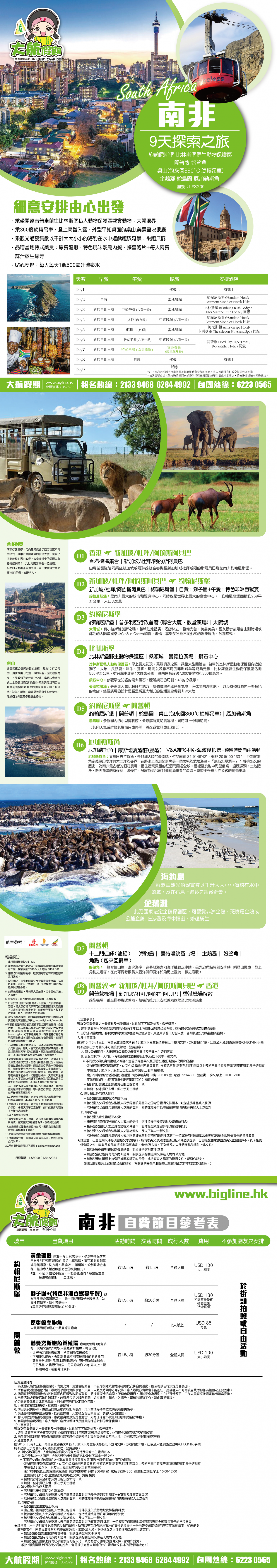 *團員繳付退票費後 (如適用): 1) 已繳款項可保留半年; 或 2) 選擇轉團後, 餘款則保留半年; 或 3) 可繳付『迫不得已理由』之手續費後, 取回已付餘款。 *個別機票+酒店套票產品如因『迫不得已理由』取消外遊行程, 處理旅客退款時亦按以上訂列收取每位退票費及手續費, 並以行程表 (套票單張) 所列為準。 責任細則: 1. 本公司保留合併團隊出發的權利。 2. 行程書或單張內所列費用根據當時機票價格及國際貨幣兌換率而訂立。外幣浮動等情況之下, 本公司保留在出發前調整各項費用的權利及徵收額外費用。 3. 所有列出的交通服務資料只供參考, 如有更改概不負責, 一切須以出票時為準。 4. 除本公司直接提供之服務外, 本公司及其職員或附屬公司或與本公司有經營關係之公司代理人身份在香港或外地安排其他獨立機構所提供之交通工具 (如飛機、輪船、火車、或遊覽巴士等) 、住宿、膳食或娛樂觀光項目等 (“委託機構”), 團員如遇交通延誤、行李遺失、意外傷亡或財物損失等, 該依照當地法律向擁有、管理或操作之委託機構直接交涉或追討賠償, 通常該等機構均各訂位不同條例, 以對客人負責。在此情況下, 本公司概不對該等損失或傷亡負責。 5. 除因由本公司之員工或其他直接管理或操作之機構之疏忽而引致團員之個人傷亡外, 本公司對團員在任何意外中之個人傷亡、經濟、娛樂或精神損失概不負責。 6. 除經本公司同意及安排, 如團員自行更改由其他人士代為參團, 本公司或其委託機構之職員有權取消其隨團之資格, 而無須發還任何團費, 而該人士在隨團期間之保險、責任賠償、行為後果等均由該人仕自行承擔。 7. 如因天氣、罷工、戰爭、怠工或安全情況影響而引致有關交通工具暫停服務, 停航或其他事故, 而必須將行程更改或取消部份行程, 本公司則將團員所繳交之費用扣除因以上事故而引致之損失後, 退回差額給團員。 8. 有關住宿、膳食、遊覽節目等問題, 均依據行程表安排, 行程先後次序有可能需要更改, 一切以當地安排為準。若遇特殊情況, 如簽證受阻, 當地酒店突告客滿或航機改變飛行時間或地點, 以及非本公司或其委託機構所能控制之因素, 令旅行團節目有增減, 或臨時更改交通工具、班機時間、機種及更換酒店等等, 本公司或其委託機構得依當時情況全權盡力處理, 團員不得藉故反對或退出, 因故取消之節目, 將不獲退還款項, 任何因延期而引致之額外支出, 本公司或其委託機構概不負責。 9. 所有酒店及住宿根據行程安排, 本公司視乎當時情形作出更改, 但不限於遇展覽會或特殊情況下, 將住宿鄰近城市之同等級酒店及住宿代替。本公司如因『迫不得已理由(外遊)』(即指戰爭、政治動盪、恐怖襲擊、天災、疫症、惡劣天氣、交通工具發生技術問題、載運機構臨時更改班次或取消服務、罷工、工業行動、旅遊目的地政府或世界衛生組織發出旅遊警示(警告)、香港特別行政區政府發出紅色或黑色外遊警示、不可抗力事件,以及業界不能控制的其他不利離開香港或在香港境外旅遊的情況)於外遊旅行團出發後更改任何項目而引致成本增加,可向顧客徵收額外費用。 10. 【已成團】代表該團號之指定出發日期預訂機位或已有足夠人數報名參加。但出發與否還受其他因素影響, 本公司保留最終決定權。 11. 任何團員在參與各項活動時, 如經常不遵守服飾人員之指引或安排, 在行動或言語上侮辱或滋擾其他團員或工作人員, 本公司或其委託機構職員有權視具體情況而取消其隨團資格而母須發任何團費, 而受該旅客監護之18歲以下同行團員亦須一併離開, 有關旅客離團後一切活動, 概與本公司或其委託機構無關。 12. 團員如欲於旅程完畢後延期返港, 須於出發前十四天提出, 以便本公司代為預定返港機位, 延期返港之機位, 未能即時作實, 團員不得藉此理由要求退出, 旅程完畢後延期逗留之費用, 概由團員自負。 13. 延期返港之團友, 必須在離境前七十二小時向航空公司確實回程機位, 任何機位如有變更, 概與本公司無關。 14. 團員如在旅途中自行離團或放棄行程, 離團後之責任自負, 一切後果與本公司或其委託機構無關。 15. 參團者須切實遵守各國及各地法例, 包括但不限於防疫防控條例, 並嚴禁攜帶違例物品出入境, 並照實申報攜帶之物品及現金。 16. 任何種類的簽證審批權及出入境批准權一律由該國或地區之領事館及/或出入境部門全權決定, 出入境如有問題, 責任旅客自負, 本公司或其委託機構母須負任何責任。如簽證已代辦, 簽證費恕不退還。 17. 即使團員持有效之入境簽證及旅遊證件, 而於入境時被當值之移民局海關人員拒絕入境, 本公司或其委託機構亦無須負任何責任。所需額外安排之食宿、交通費用、全部由其本人負責, 其餘下的行程亦將不會獲得任何補償, 亦不得要求退款或改團。 18. 中國內地相關法規規定, 即日起旅客入住中國內地境內酒店時, 公安機關會透過酒店前台向旅客一併採集人像信息資訊。 19. 如出現一些非本公司能力範圍可控制之問題 (如花卉、紅葉提早凋謝或景觀、自然現象、景點活動或戶外項目) 會受天氣等因素影響, 如未能安排則取消不作任何退款安排。 20. 旅客如在旅程中確診 COVID-19或其他傳染病,無論受到當地政府隔離或其他檢疫要求影響與否,為確保其他旅客之安全,確診旅