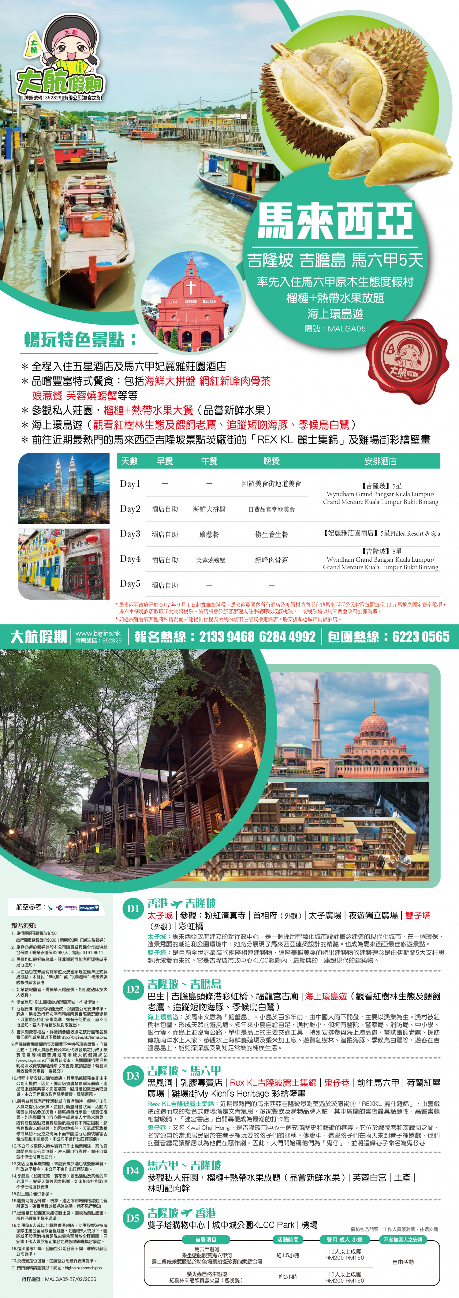 *團員繳付退票費後 (如適用): 1) 已繳款項可保留半年; 或 2) 選擇轉團後, 餘款則保留半年; 或 3) 可繳付『迫不得已理由』之手續費後, 取回已付餘款。 *個別機票+酒店套票產品如因『迫不得已理由』取消外遊行程, 處理旅客退款時亦按以上訂列收取每位退票費及手續費, 並以行程表 (套票單張) 所列為準。 責任細則: 1. 本公司保留合併團隊出發的權利。 2. 行程書或單張內所列費用根據當時機票價格及國際貨幣兌換率而訂立。外幣浮動等情況之下, 本公司保留在出發前調整各項費用的權利及徵收額外費用。 3. 所有列出的交通服務資料只供參考, 如有更改概不負責, 一切須以出票時為準。 4. 除本公司直接提供之服務外, 本公司及其職員或附屬公司或與本公司有經營關係之公司代理人身份在香港或外地安排其他獨立機構所提供之交通工具 (如飛機、輪船、火車、或遊覽巴士等) 、住宿、膳食或娛樂觀光項目等 (“委託機構”), 團員如遇交通延誤、行李遺失、意外傷亡或財物損失等, 該依照當地法律向擁有、管理或操作之委託機構直接交涉或追討賠償, 通常該等機構均各訂位不同條例, 以對客人負責。在此情況下, 本公司概不對該等損失或傷亡負責。 5. 除因由本公司之員工或其他直接管理或操作之機構之疏忽而引致團員之個人傷亡外, 本公司對團員在任何意外中之個人傷亡、經濟、娛樂或精神損失概不負責。 6. 除經本公司同意及安排, 如團員自行更改由其他人士代為參團, 本公司或其委託機構之職員有權取消其隨團之資格, 而無須發還任何團費, 而該人士在隨團期間之保險、責任賠償、行為後果等均由該人仕自行承擔。 7. 如因天氣、罷工、戰爭、怠工或安全情況影響而引致有關交通工具暫停服務, 停航或其他事故, 而必須將行程更改或取消部份行程, 本公司則將團員所繳交之費用扣除因以上事故而引致之損失後, 退回差額給團員。 8. 有關住宿、膳食、遊覽節目等問題, 均依據行程表安排, 行程先後次序有可能需要更改, 一切以當地安排為準。若遇特殊情況, 如簽證受阻, 當地酒店突告客滿或航機改變飛行時間或地點, 以及非本公司或其委託機構所能控制之因素, 令旅行團節目有增減, 或臨時更改交通工具、班機時間、機種及更換酒店等等, 本公司或其委託機構得依當時情況全權盡力處理, 團員不得藉故反對或退出, 因故取消之節目, 將不獲退還款項, 任何因延期而引致之額外支出, 本公司或其委託機構概不負責。 9. 所有酒店及住宿根據行程安排, 本公司視乎當時情形作出更改, 但不限於遇展覽會或特殊情況下, 將住宿鄰近城市之同等級酒店及住宿代替。本公司如因『迫不得已理由(外遊)』(即指戰爭、政治動盪、恐怖襲擊、天災、疫症、惡劣天氣、交通工具發生技術問題、載運機構臨時更改班次或取消服務、罷工、工業行動、旅遊目的地政府或世界衛生組織發出旅遊警示(警告)、香港特別行政區政府發出紅色或黑色外遊警示、不可抗力事件,以及業界不能控制的其他不利離開香港或在香港境外旅遊的情況)於外遊旅行團出發後更改任何項目而引致成本增加,可向顧客徵收額外費用。 10. 【已成團】代表該團號之指定出發日期預訂機位或已有足夠人數報名參加。但出發與否還受其他因素影響, 本公司保留最終決定權。 11. 任何團員在參與各項活動時, 如經常不遵守服飾人員之指引或安排, 在行動或言語上侮辱或滋擾其他團員或工作人員, 本公司或其委託機構職員有權視具體情況而取消其隨團資格而母須發任何團費, 而受該旅客監護之18歲以下同行團員亦須一併離開, 有關旅客離團後一切活動, 概與本公司或其委託機構無關。 12. 團員如欲於旅程完畢後延期返港, 須於出發前十四天提出, 以便本公司代為預定返港機位, 延期返港之機位, 未能即時作實, 團員不得藉此理由要求退出, 旅程完畢後延期逗留之費用, 概由團員自負。 13. 延期返港之團友, 必須在離境前七十二小時向航空公司確實回程機位, 任何機位如有變更, 概與本公司無關。 14. 團員如在旅途中自行離團或放棄行程, 離團後之責任自負, 一切後果與本公司或其委託機構無關。 15. 參團者須切實遵守各國及各地法例, 包括但不限於防疫防控條例, 並嚴禁攜帶違例物品出入境, 並照實申報攜帶之物品及現金。 16. 任何種類的簽證審批權及出入境批准權一律由該國或地區之領事館及/或出入境部門全權決定, 出入境如有問題, 責任旅客自負, 本公司或其委託機構母須負任何責任。如簽證已代辦, 簽證費恕不退還。 17. 即使團員持有效之入境簽證及旅遊證件, 而於入境時被當值之移民局海關人員拒絕入境, 本公司或其委託機構亦無須負任何責任。所需額外安排之食宿、交通費用、全部由其本人負責, 其餘下的行程亦將不會獲得任何補償, 亦不得要求退款或改團。 18. 中國內地相關法規規定, 即日起旅客入住中國內地境內酒店時, 公安機關會透過酒店前台向旅客一併採集人像信息資訊。 19. 如出現一些非本公司能力範圍可控制之問題 (如花卉、紅葉提早凋謝或景觀、自然現象、景點活動或戶外項目) 會受天氣等因素影響, 如未能安排則取消不作任何退款安排。 20. 旅客如在旅程中確診 COVID-19或其他傳染病,無論受到當地政府隔離或其他檢疫要求影響與否,為確保其他旅客之安全,確診旅