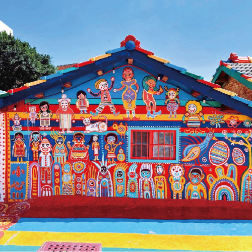 彩虹村位於臺中市,園區內所有的彩繪作品皆來自彩虹爺爺-黃永阜先生,他融入在地感動的元素,發揮巧思,在老屋上彩繪五顏六色,充滿童趣的圖畫。走入繽紛夢幻的圖塊巷弄間,彷彿進入童話世界,吸引國內外遊客前往觀賞拍照朝聖,成為臺中人氣景點之一。
