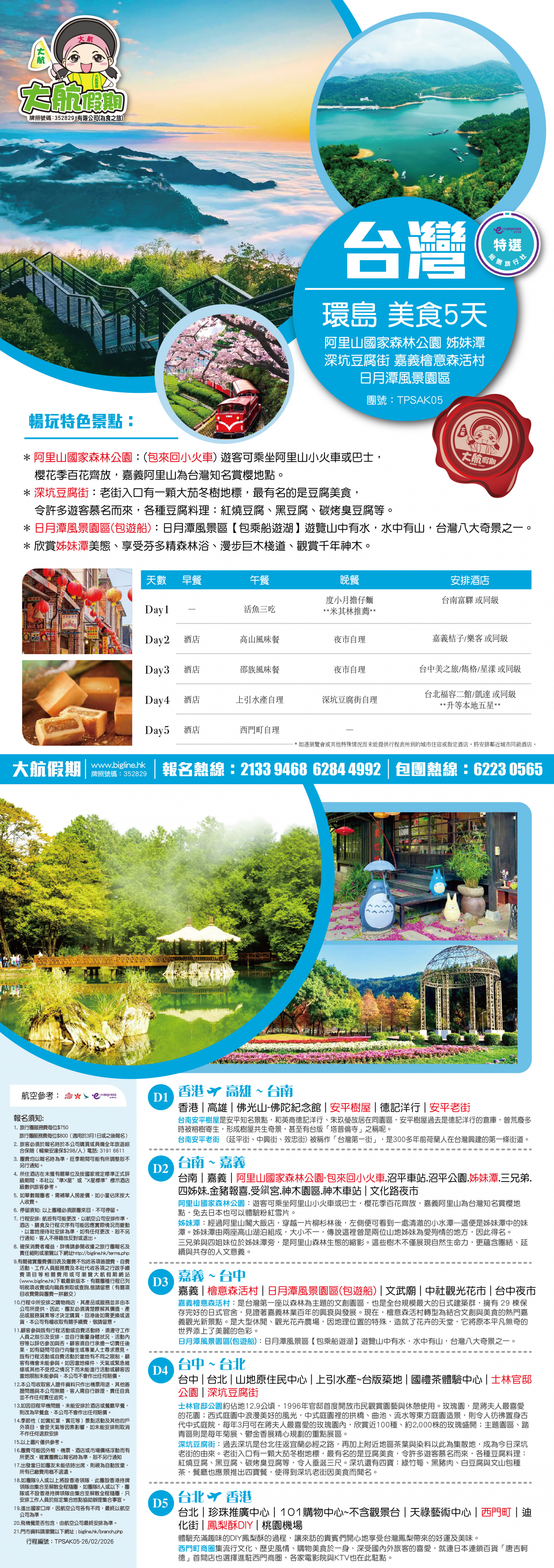 *團員繳付退票費後 (如適用): 1) 已繳款項可保留半年; 或 2) 選擇轉團後, 餘款則保留半年; 或 3) 可繳付『迫不得已理由』之手續費後, 取回已付餘款。 *個別機票+酒店套票產品如因『迫不得已理由』取消外遊行程, 處理旅客退款時亦按以上訂列收取每位退票費及手續費, 並以行程表 (套票單張) 所列為準。 責任細則: 1. 本公司保留合併團隊出發的權利。 2. 行程書或單張內所列費用根據當時機票價格及國際貨幣兌換率而訂立。外幣浮動等情況之下, 本公司保留在出發前調整各項費用的權利及徵收額外費用。 3. 所有列出的交通服務資料只供參考, 如有更改概不負責, 一切須以出票時為準。 4. 除本公司直接提供之服務外, 本公司及其職員或附屬公司或與本公司有經營關係之公司代理人身份在香港或外地安排其他獨立機構所提供之交通工具 (如飛機、輪船、火車、或遊覽巴士等) 、住宿、膳食或娛樂觀光項目等 (“委託機構”), 團員如遇交通延誤、行李遺失、意外傷亡或財物損失等, 該依照當地法律向擁有、管理或操作之委託機構直接交涉或追討賠償, 通常該等機構均各訂位不同條例, 以對客人負責。在此情況下, 本公司概不對該等損失或傷亡負責。 5. 除因由本公司之員工或其他直接管理或操作之機構之疏忽而引致團員之個人傷亡外, 本公司對團員在任何意外中之個人傷亡、經濟、娛樂或精神損失概不負責。 6. 除經本公司同意及安排, 如團員自行更改由其他人士代為參團, 本公司或其委託機構之職員有權取消其隨團之資格, 而無須發還任何團費, 而該人士在隨團期間之保險、責任賠償、行為後果等均由該人仕自行承擔。 7. 如因天氣、罷工、戰爭、怠工或安全情況影響而引致有關交通工具暫停服務, 停航或其他事故, 而必須將行程更改或取消部份行程, 本公司則將團員所繳交之費用扣除因以上事故而引致之損失後, 退回差額給團員。 8. 有關住宿、膳食、遊覽節目等問題, 均依據行程表安排, 行程先後次序有可能需要更改, 一切以當地安排為準。若遇特殊情況, 如簽證受阻, 當地酒店突告客滿或航機改變飛行時間或地點, 以及非本公司或其委託機構所能控制之因素, 令旅行團節目有增減, 或臨時更改交通工具、班機時間、機種及更換酒店等等, 本公司或其委託機構得依當時情況全權盡力處理, 團員不得藉故反對或退出, 因故取消之節目, 將不獲退還款項, 任何因延期而引致之額外支出, 本公司或其委託機構概不負責。 9. 所有酒店及住宿根據行程安排, 本公司視乎當時情形作出更改, 但不限於遇展覽會或特殊情況下, 將住宿鄰近城市之同等級酒店及住宿代替。本公司如因『迫不得已理由(外遊)』(即指戰爭、政治動盪、恐怖襲擊、天災、疫症、惡劣天氣、交通工具發生技術問題、載運機構臨時更改班次或取消服務、罷工、工業行動、旅遊目的地政府或世界衛生組織發出旅遊警示(警告)、香港特別行政區政府發出紅色或黑色外遊警示、不可抗力事件,以及業界不能控制的其他不利離開香港或在香港境外旅遊的情況)於外遊旅行團出發後更改任何項目而引致成本增加,可向顧客徵收額外費用。 10. 【已成團】代表該團號之指定出發日期預訂機位或已有足夠人數報名參加。但出發與否還受其他因素影響, 本公司保留最終決定權。 11. 任何團員在參與各項活動時, 如經常不遵守服飾人員之指引或安排, 在行動或言語上侮辱或滋擾其他團員或工作人員, 本公司或其委託機構職員有權視具體情況而取消其隨團資格而母須發任何團費, 而受該旅客監護之18歲以下同行團員亦須一併離開, 有關旅客離團後一切活動, 概與本公司或其委託機構無關。 12. 團員如欲於旅程完畢後延期返港, 須於出發前十四天提出, 以便本公司代為預定返港機位, 延期返港之機位, 未能即時作實, 團員不得藉此理由要求退出, 旅程完畢後延期逗留之費用, 概由團員自負。 13. 延期返港之團友, 必須在離境前七十二小時向航空公司確實回程機位, 任何機位如有變更, 概與本公司無關。 14. 團員如在旅途中自行離團或放棄行程, 離團後之責任自負, 一切後果與本公司或其委託機構無關。 15. 參團者須切實遵守各國及各地法例, 包括但不限於防疫防控條例, 並嚴禁攜帶違例物品出入境, 並照實申報攜帶之物品及現金。 16. 任何種類的簽證審批權及出入境批准權一律由該國或地區之領事館及/或出入境部門全權決定, 出入境如有問題, 責任旅客自負, 本公司或其委託機構母須負任何責任。如簽證已代辦, 簽證費恕不退還。 17. 即使團員持有效之入境簽證及旅遊證件, 而於入境時被當值之移民局海關人員拒絕入境, 本公司或其委託機構亦無須負任何責任。所需額外安排之食宿、交通費用、全部由其本人負責, 其餘下的行程亦將不會獲得任何補償, 亦不得要求退款或改團。 18. 中國內地相關法規規定, 即日起旅客入住中國內地境內酒店時, 公安機關會透過酒店前台向旅客一併採集人像信息資訊。 19. 如出現一些非本公司能力範圍可控制之問題 (如花卉、紅葉提早凋謝或景觀、自然現象、景點活動或戶外項目) 會受天氣等因素影響, 如未能安排則取消不作任何退款安排。 20. 旅客如在旅程中確診 COVID-19或其他傳染病,無論受到當地政府隔離或其他檢疫要求影響與否,為確保其他旅客之安全,確診旅