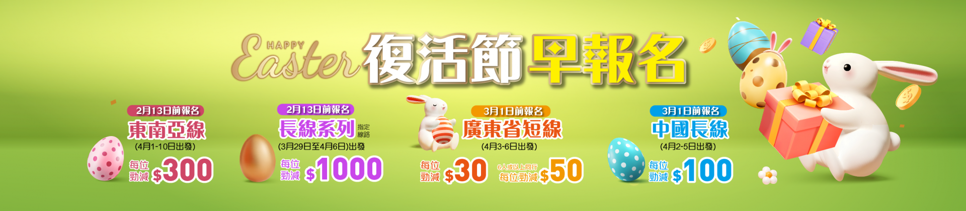 復活節(中長線)早報優惠(4月2-5日出發之團隊)