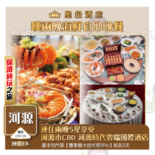 【24小時Hea酒店】《3大自助餐》保證入住鬧市中心~頂級奢華【東莞東城國際酒店】豪嘆《酒店豪華海鮮自助晚餐》+ 《現開生蠔海鮮自助午餐》特別安排大航貴賓<歡聚會 Party Room> 純玩2天