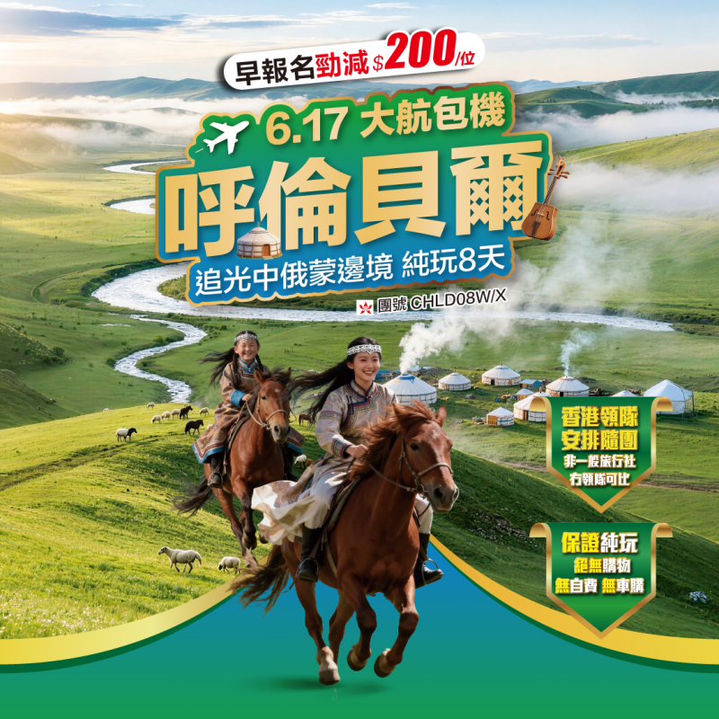 「6.17呼倫貝爾包機」 追光中俄蒙邊境# 住北極村內「大航專場草原那達慕」 越野穿越大草原 《馬之舞演出》 敖魯古雅部落(專屬通道)親近馴鹿 滿洲里 「住蒙古包 私家牧場遊牧 民俗體驗」 8天