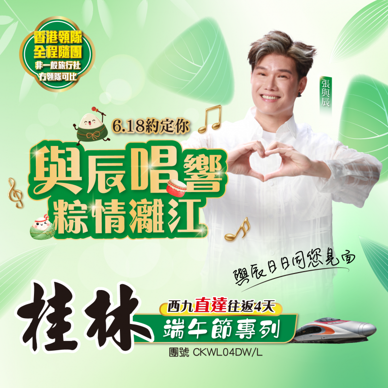 端午節#6.18桂林專列【與辰唱響 粽情灕江】香格里拉酒店包場<張與辰音樂晚宴>專場陪你DIY包粽子(3晚連住桂林)龍脊梯田<輕鬆抵達觀景平台+拍攝旅行vlog>船遊一江四湖 堯山<纜車往返>純玩4天