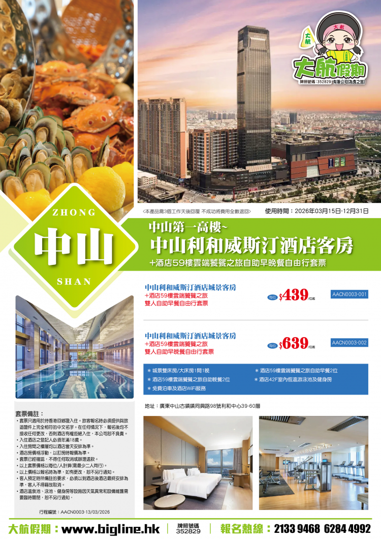 1.AACN0003-001 中山利和威斯汀酒店城景客房+酒店59樓雲端饕餮之旅雙人自助早餐自由行套票 $439/人起