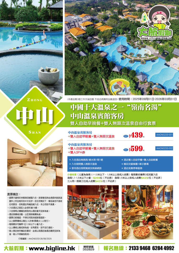 AACN0233-001中山溫泉賓館客房+雙人自助早晚餐+雙人無限次溫泉自由行套票 $439/位起