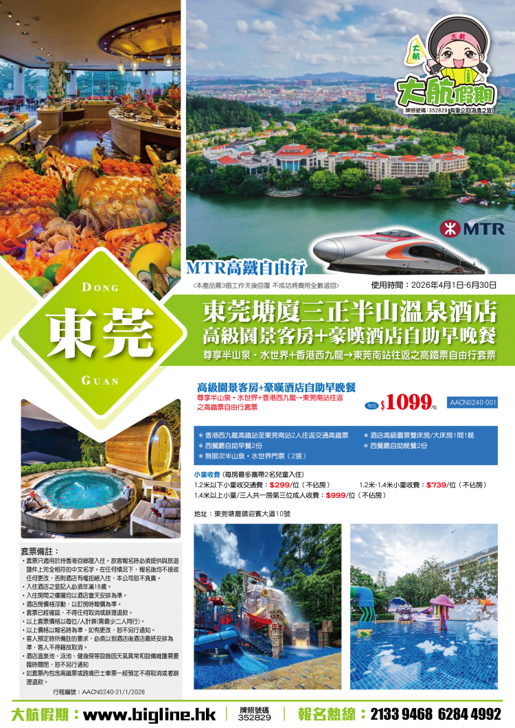 東莞塘廈三正半山溫泉酒店高級園景客房+豪嘆酒店自助早晚餐尊享半山泉•水世界+香港西九龍高鐵站→東莞南站往返交通自由行套票
