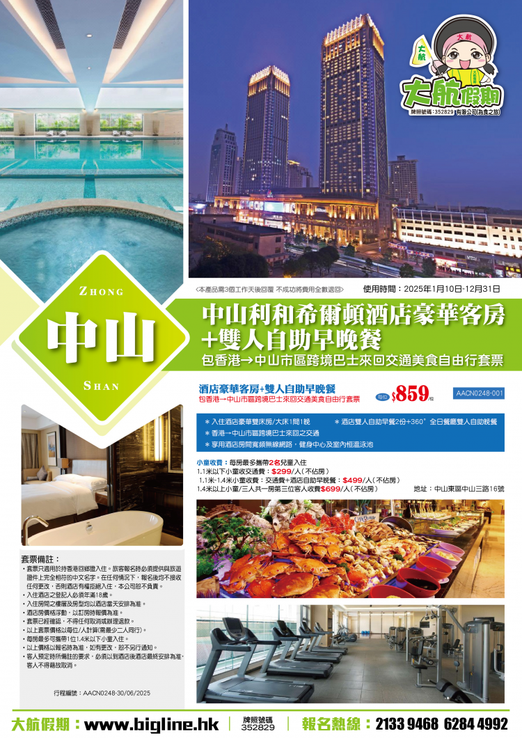 中山利和希爾頓酒店豪華客房+雙人自助早晚餐+香港→中山市區跨境巴士來回交通美食自由行套票